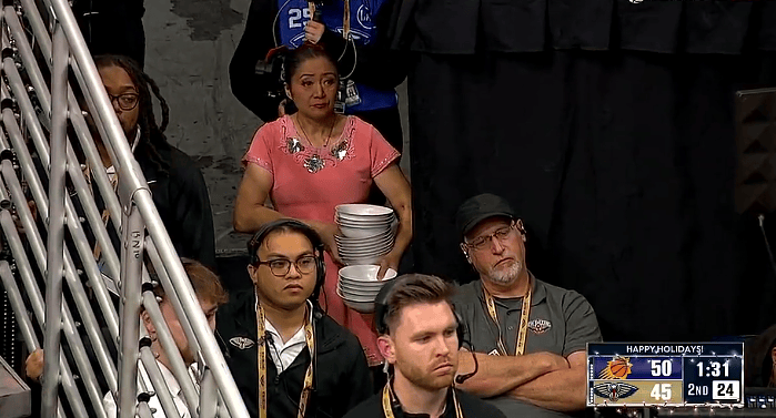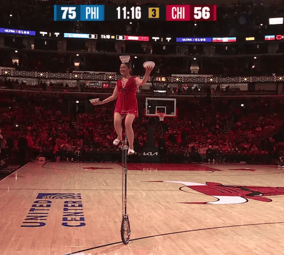 第二节比赛中,太阳上半场领先鹈鹕,牛蓉场边候场准备中场表演独轮车。