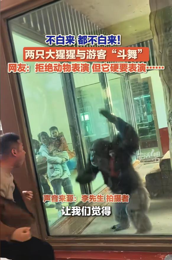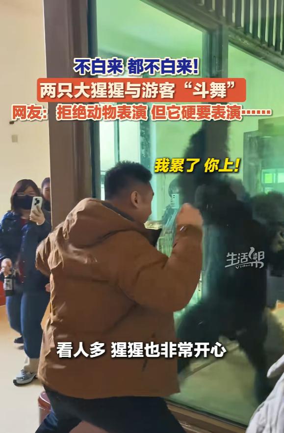 “都不白来!”12月21日,山东济南,一男子去动物园,发现一只猩猩模仿他,觉得有趣,男子就开始跳舞,没想到猩猩也跟着跳,另一只猩猩也被吸引过来,加入了这场表演,就这样,2只猩猩隔着玻璃开始和男子“斗舞”。网友:这门票花得值! 这年头去动物园,大多是隔着笼子或玻璃的单向观看,游客举着手机拍,动物们要么慵懒趴着,要么发呆觅食,热闹归热闹,却少了点意外互动,可济南这天的这场奇遇,彻底打破了这种单调模式,让普通的逛园变成了一场即兴狂欢。 当时这位大哥正慢悠悠在园区闲逛,路过猩猩馆时,忽然感觉有一道视线牢牢锁住了自己,他抬头一看,馆内一只大猩猩没有像同伴那样发呆找食,正定定地盯着他,眼神里满是好奇,这种不期而遇的眼神交汇,一下子勾起了大哥的兴致,他试探性地抬起手,跟猩猩打了个招呼。 没想到神奇的互动瞬间就发生了,这只黑猩猩没有无视或转身离开,反而像是找到了志同道合的玩伴,精准接住了大哥的动作信号,学着样子抬起手挥了挥,回应了这个招呼,一来一回的简单互动,瞬间拉满了默契,也让大哥来了兴致。 觉得只打招呼不过瘾,大哥索性放开了,当场在玻璃前跳了起来,把这里当成了临时舞台,这一跳可不要紧,玻璃里头的猩猩瞬间被激起了兴致,仿佛接收到了挑战半点不示弱,当场就把玻璃房当成了自己的练功房,跟着大哥的节奏模仿起来。 只见这只大猩猩凭着超强的模仿能力,跟着大哥的动作左右摇摆,庞大的身躯却意外灵活,长长的手臂在空中大开大合,每一个动作都紧紧跟着节奏,那股子非要跟大哥比个高下的劲头,看得人忍俊不禁,一人一猩隔着玻璃斗舞,画面既荒诞又欢乐。 更让人惊喜的剧情还在后头。就在一人一猩斗得难解难分、不亦乐乎的时候,旁边另一只原本在一旁观望的猩猩,也被这热闹的场面吸引了过来,没有丝毫生分,它一凑过来就加入了战局,瞬间把单人对决变成了双猩伴舞。 两只猩猩像是提前商量好了一般,默契配合着玻璃外大哥的动作,同步扭动、挥手,动作夸张又魔性,那一刻隔着的玻璃仿佛完全消失了,大哥在外面尽情蹦跶,两只猩猩在里头尽兴回应,三者之间形成了奇妙的共鸣,原本安静的猩猩馆,硬生生变成了自带氛围的欢乐现场。 这突如其来的跨物种斗舞,感染力十足,原本各自参观的游客,看到这边的热闹景象,都纷纷被吸引过来,围在玻璃前驻足观看,大伙儿看着这魔幻又欢乐的场面,全都笑得前仰后合,拿出手机记录下这难得的瞬间,现场气氛一下子冲到了顶点。 要知道这种纯天然、无彩排的即兴互动,可不是花钱就能预定到的,馆内的两只猩猩看着围观的人群,不仅没有丝毫怯场,反而越跳越嗨,投入又放松,那股子认真较劲的模样,哪怕是最挑剔的人,也得承认这样的场面可遇不可求。 后来这段视频被传到网上,引发了不少网友热议,大家向来抵制强迫动物做违背天性的表演,更愿意看到动物自由自在的模样,可面对济南这一幕,网友们的话风彻底转变,纷纷表示虽然拒绝动物表演,但要是动物主动硬要给你表演,是真的拒绝不了。 还有网友调侃这位大哥哪里是去逛动物园,分明是去见一见如故的“知音”,哪怕物种不同,哪怕隔着无法逾越的玻璃,只要节奏对上了,快乐就能跨越界限。 那个冬日的下午,大哥和两只猩猩用一场即兴斗舞,给在场所有人都带来了最质朴的欢乐,不管是参与其中的大哥,还是围观的游客,这趟动物园之行都没白来,这门票钱,确实花得太值了。 (信息来源:《男子在动物园玻璃前与猩猩激情共舞!大猩猩:兄弟你咋出去的? 网友:找饲养员,有个忘了关进去了!》生活帮)