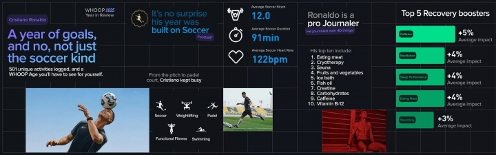 直播吧12月27日讯健康监测设备whoop公布40岁C罗2025年度的健康报告,这一年记录了501项独特活动,并指出C罗的身体年龄为28岁,比实际年龄年轻12岁。