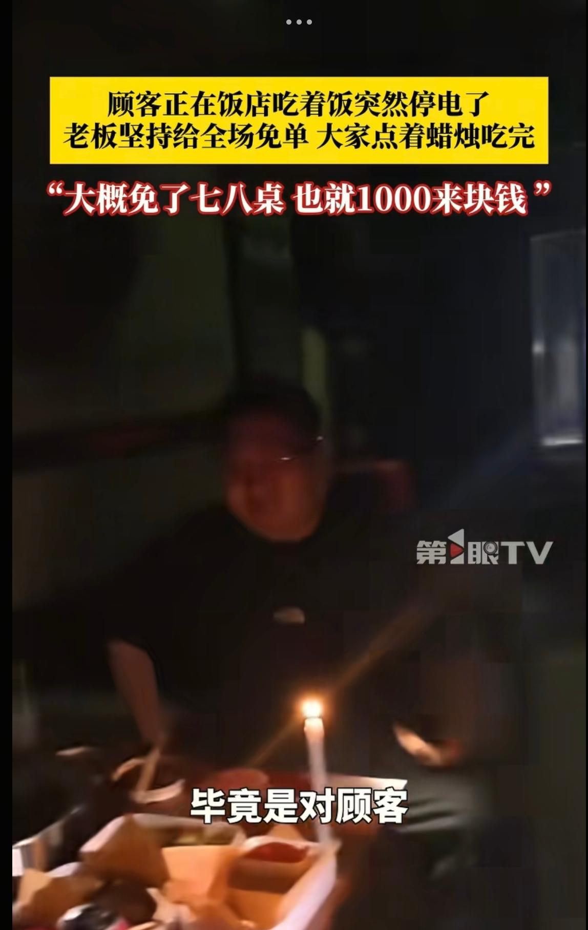 “这老板有格局!”12月21日,辽宁鞍山,火锅店营业过程中突然停电,老板娘觉得不好意思,就给所有顾客都免单了,顾客也十分理解,但是坚决要付些钱才行,不能白吃!有些顾客还点着蜡烛把饭吃完了。网友:太有人情味了! 当天傍晚这家火锅店和往常一样座无虚席,热气腾腾的锅底冒着白烟,食客们围坐一桌,谈天说地吃得正香,突然店内的灯光、空调、抽油烟机同时熄灭,整个空间一下子暗了下来,只剩下锅底残留的微弱热气和窗外透进来的天光,突如其来的停电,让原本喧闹的店里瞬间安静了几秒,大家都有些猝不及防。 火锅店老板和员工也慌了神,赶紧检查电路,尝试联系供电部门,可短时间内根本无法恢复供电,看着满店食客老板娘心里满是愧疚,觉得是自己店里出了状况,耽误了大家用餐,还扫了兴致,没有丝毫犹豫,她当即决定给店里所有正在用餐的顾客全部免单,以此弥补这次意外带来的不便。 老板娘挨桌跟顾客说明情况,语气诚恳地表达歉意,同时告知大家不用付钱安心离开就好,这番举动让在场的顾客都十分意外,更让人心里暖暖的。 大家都明白停电是不可抗力,并不是店家的故意疏忽,而且店里已经把食材都端上了桌,付出了成本,就这样免单,店家无疑要承担不小的损失。 所以面对老板娘的好意,顾客们纷纷表示理解,却坚决不肯白吃,执意要付些钱才行,有人说自己已经吃得差不多了,该结的账必须结,有人主动扫码支付,还特意多付了一点,让店家多少弥补点成本,还有人跟老板娘说不用放在心上,谁都难免遇到意外没必要免单,你一言我一语没有丝毫抱怨,全是互相体谅的温柔。 更让人动容的是,不少顾客并没有因为停电就匆匆离开,反而让店家找来蜡烛,点着蜡烛继续用餐,几根小小的蜡烛被点燃,昏黄的光晕笼罩着餐桌,原本昏暗的店内多了几分温馨的氛围,大家就着烛光,慢慢品尝桌上的美食,聊天的声音也渐渐恢复,反而比平时多了一份特别的体验。 有顾客拿出手机,记录下这难得的烛光晚餐场景,画面里没有烦躁和不满,只有食客们的从容和店家的诚恳,有人调侃说这辈子吃过不少火锅,点着蜡烛吃火锅还是头一回,这份经历既特别又暖心,员工们也没有因为停电懈怠,借着烛光忙着给顾客添汤、收拾餐具,服务依旧周到。 其实在餐饮行业,遇到停电、食材问题等意外很常见,有些店家可能会敷衍了事,有些顾客也可能会借机发难,但这家火锅店的老板娘,在意外发生后第一时间考虑的是顾客的感受,用免单的方式表达歉意,这份大气和格局让人敬佩,而顾客们也没有得寸进尺,反而换位思考,主动承担费用,这份体谅也同样难得。 这场突如其来的停电,没有酿成纠纷,反而成了检验人心的试金石,让大家感受到了人与人之间的善意与温暖,老板娘的格局顾客们的通情达理,交织成了最动人的画面。后来这段视频被传到网上,引发了不少网友热议,大家都被这份双向的人情味打动,纷纷留言称赞。 有网友说老板娘这波操作看似亏了,实则赢了人心,以后大家肯定都愿意来这家有温度的店吃饭,也有网友感慨,这才是社会该有的样子,互相理解、互相包容,少点计较,多点善意,一顿火锅一场意外,却让我们看到了最朴素的人情世故。 其实做生意拼的不只是口味和价格,更重要的是服务和人情味老板娘用一份大气,换来了顾客的认可和支持,顾客用一份体谅,温暖了店家的心,这样的双向奔赴,不仅让这顿停电后的火锅格外难忘,也给这个寒冷的冬日,添了不少暖意,这老板格局是真的大!