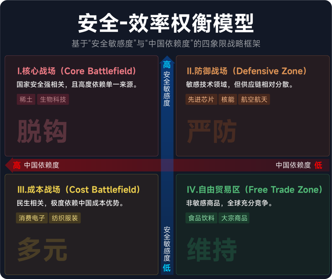 现在,你应该看懂了这四块战场:核心战场,防御战场,成本战场,和自由贸易区。以及,美国采用的四种策略:脱钩,严防,多元,和维持。