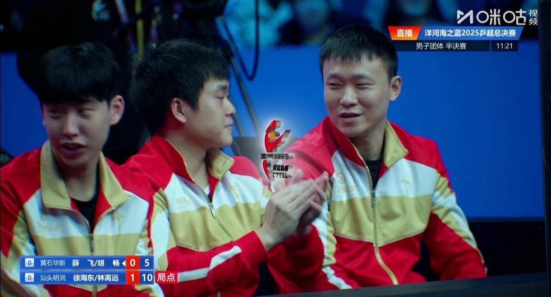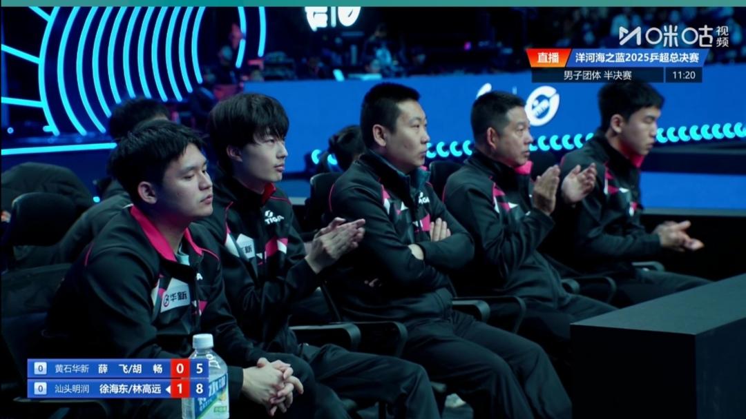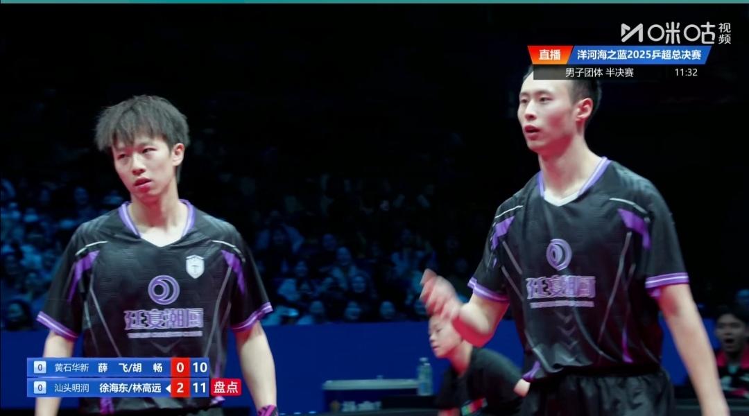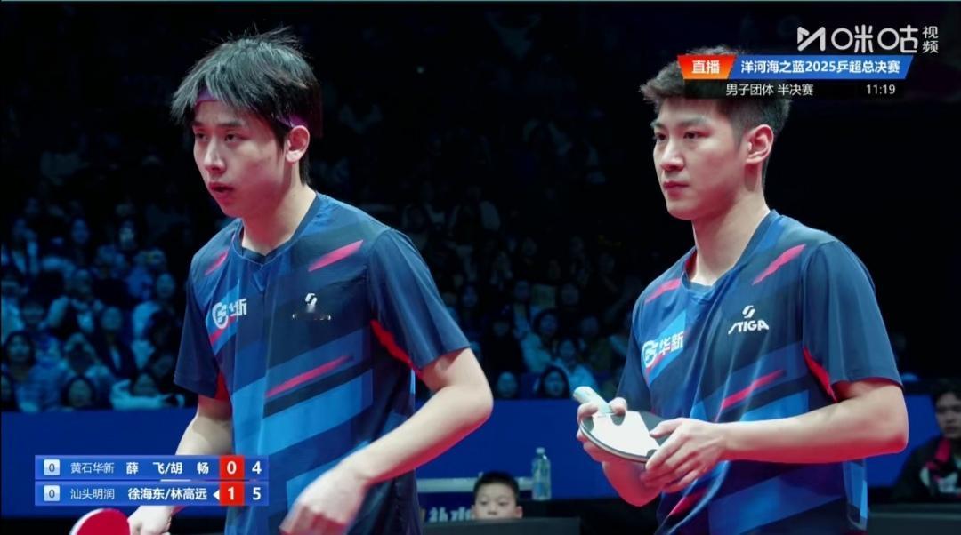 汕头明润男双3:0拔得头筹! 2025乒超级联赛总决赛,男团半决赛 汕头明润Vs黄石华新 黄石华新1号主力,单打世界排名第2的小石头林诗栋为什么也休战呢? 第一盘双打 林高远/徐海东3:0(11-4;11-5;12-10)零封黄石华新薛飞/胡畅。 看来今年双打最佳MVP又是汕头明润林高远莫属了! 第二盘陈垣宇1:3(6-11;6-11;11-5;6-11)负黄石华新向鹏。 第三盘林高远Vs黄石华兴胡畅 第四盘徐海东Vs黄石黄郭向鹏 第五盘 陈垣宇Vs黄石黄新薛飞 比赛正在进行中!
