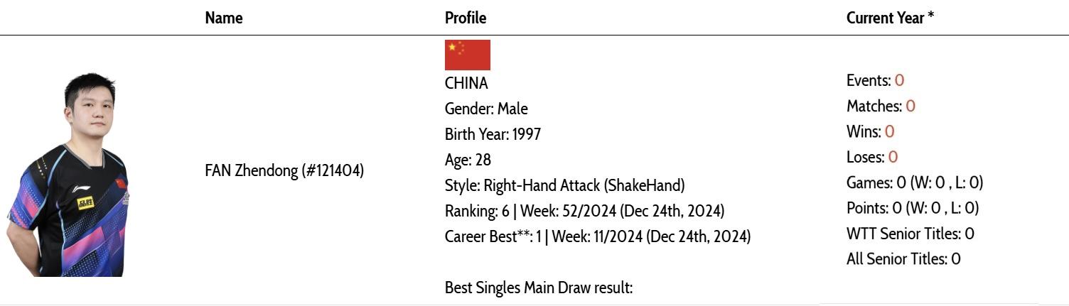 国际赛事:樊振东于2024年12月27日宣布退出世界排名