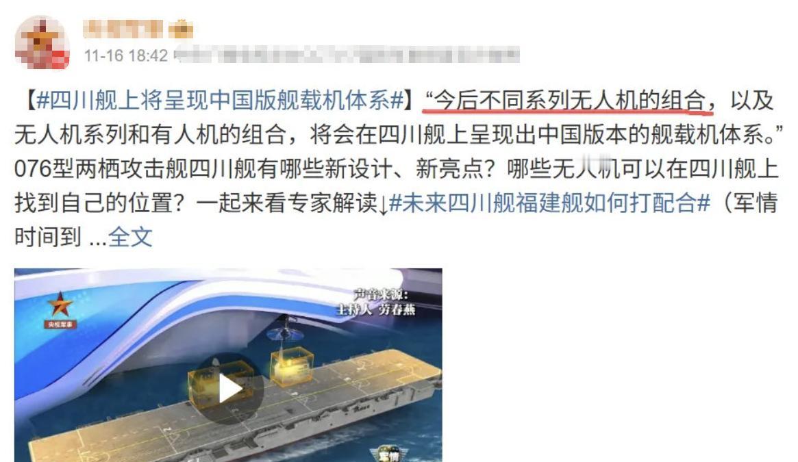 好吧,在国产076型两栖弹射型攻击舰首舰“四川舰”这里,我们真的见识到了何为“一上来就开大”。先是第二次海试的时间持续达近1个月之久,在全球各国新型舰艇的海试工作中都属罕见,证明自身极其过硬的建造质量。这还不算完,外界很快就发现了一个新的惊喜:在回港后的“四川舰”飞行甲板上,首次出现了一款舰载机的身影! 据美国防务媒体“战区”报道,“四川舰”飞行甲板上的固定翼舰载机,在外形轮廓方面很接近此前于“9•3大阅兵”中接受公开检阅的一款机型,即那款进气道位于机身背部前部、采用兰姆达翼型为主翼、带有V型外倾双垂尾的隐身无人机。 该机首次曝光时,外界就猜测其可能是一款注重对地对海打击、兼具一定的自卫空战能力,且有着良好隐身外形设计的无人机,不仅具备成为“忠诚僚机”的潜力,还有望独立遂行某些作战任务。而今看来,该机可能采用了“一机多型”的开发思路,即既有陆基型,也有舰载型。 当然了,不排除随舰出海还只是这款无人机的全尺寸模型。正如此前的“辽宁舰”、“山东舰”和“福建舰”等航空母舰,以及075型两栖攻击舰各舰的海试过程那般,先在海试阶段搭载舰载机全尺寸模型,以开展诸如甲板摆放、甲板调度、机库调度、升降机运转、甲板模拟维护和机库内模拟修理等科目的测试。待最终启动舰载机放飞和着舰等测试时,再换成正儿八经的实机上舰。 不过无论如何,才刚刚是第二次海试,就让飞行甲板不再是“空空如也”,如此进度已然可用“快得惊人”来形容了。同时需要注意的是,这还只是个开始。回想今年11月,央视军事频道在一则报道中提到,“在‘四川舰’上,将呈现出中国版本的舰载机体系”,其中提到了“今后不同系列无人机的组合,以及无人机系列和有人机的组合”。很显然,这意味着“四川舰”未来所搭载的舰载无人机型号将不止一款。 得益于舰载机型号的丰富和不同配置,“四川舰”将可在遂行两栖登陆作战任务的同时,于航空作战领域扮演起多种角色。举例来说,以搭载舰载无人攻击机为主的对面打击型航空作战配置、以搭载舰载无人战斗机为主的制空型航空作战配置,以及以搭载舰载无人反潜机为主的反潜型航空作战配置等。这就是为什么说,当下现身“四川舰”飞行甲板上的舰载无人机或全尺寸模型,仅仅是个开始。 战时,“四川舰”将有望编入以“福建舰”等正规航母为核心的战斗群,以“常务副航母”的身份协助正规航母作战;抑或是让前者单独进行战斗群编组,负责次要方向的海空作战。有理由相信,该舰很快就会在后续的海试工作中搭载更多型号的舰载机或舰载机全尺寸模型,歼-35、直-20、直-18和更多的无人舰载机,都将有望陆续现身。