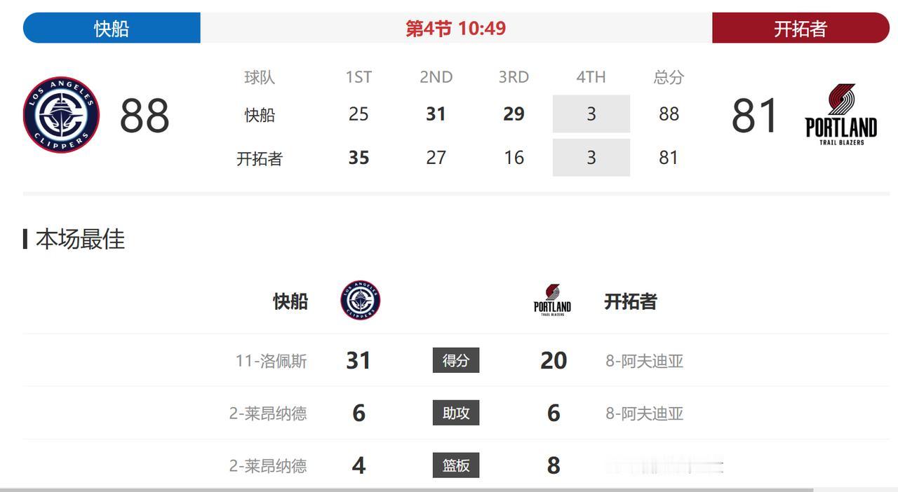 三分开了的大洛确实香啊! 之前感觉大洛又老又慢的,那会都被DNP了,真没想到还能打出来这表现啊,目前为止三分已经13中9了,快船全队三分都很准,整体是34中17,大洛一个人就投中了9个,占了一大半。 没有祖巴茨,虽然快船的篮板被开拓者予取予求,但有了大洛的三分,快船的空间也是真舒服啊。其实祖巴茨和大洛,他俩这种优缺点明显的内线,就需要泰伦卢根据对手灵活使用的,而不是像之前那样把祖巴茨和邓恩一起放到场上 目前快船带着7分的领先优势进入第四节了,如果今天能赢下开拓者,那快船将会迎来赛季的第一个三连胜