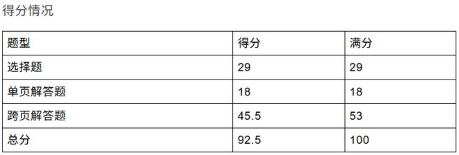 答案是:AI系统得分92.5(满分100分),虽不及学生最高得分97.5分,但也远高于72分的班级平均分,且3小时的考试仅用了30分钟。