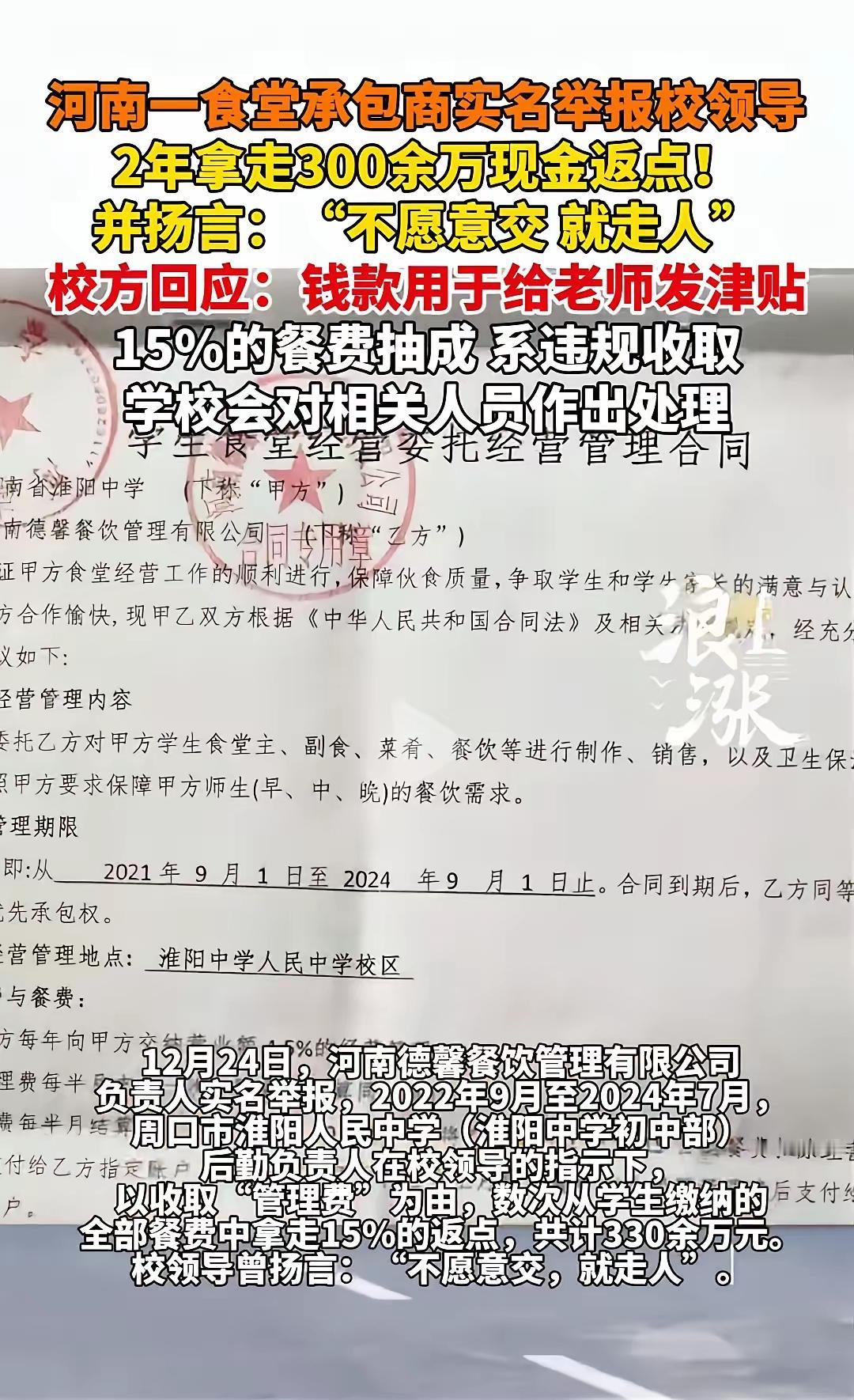 河南,一女子承包食堂,学校3000人,学校按每个学生每天20元收取餐费,她每年支付餐费的4.5%给学校作为管理费,可合同期内,学校领导却单方面将管理费涨至15%,并表示不愿意交就走人! 这事说出来真的让人火大,好好的食堂承包生意,愣是被某些校领导的贪婪搅成了一锅浑水。咱们先算笔明白账,3000名学生,每人每天20元餐费,一天的餐费总额就是6万元,一年按上学200天算,那就是1200万元的大盘子。原本合同里白纸黑字写着4.5%的管理费,折算下来一年也就54万元,这个比例在食堂承包的行规里算是合理范畴,承包商能赚点辛苦钱,学生们也能吃到保质保量的饭菜,本是皆大欢喜的局面。 可谁能想到,合同期还没到,某些校领导就坐不住了,硬生生把管理费从4.5%抬到了15%,涨幅直接翻了三倍还多!更过分的是,他们放出的话简直霸道得离谱——“不愿意交就走人”。这话里的威胁意味,明眼人都能看出来。这位女承包商心里能不委屈吗?前期为了把食堂办起来,她肯定砸了不少钱搞装修、买设备、招员工,这些实打实的投入,哪能说撤就撤?就像你辛辛苦苦种了一片果园,眼看要结果了,突然有人跳出来说要把地租涨三倍,不答应就把你赶出去,换谁都得咬牙忍下来。 没办法,女承包商只能捏着鼻子认了,这一忍就是两年。两年时间,15%的管理费硬生生从她的利润里抠走了330多万元的现金返点。这笔钱,可不是小数目,足够再开一家像样的食堂了。被压榨到忍无可忍,这位女承包商终于选择了实名举报,把这些见不得光的猫腻全抖搂了出来。 面对举报,校方的回应倒是来得挺快,说这笔钱款是用来给老师发放津贴的,还承认15%的管理费属于违规收取,会对相关人员进行处理。这话听着冠冕堂皇,可仔细琢磨琢磨,满是漏洞。给老师发津贴,难道就该靠压榨食堂承包商、牺牲学生餐食质量来凑钱吗?这简直是本末倒置! 咱们再往深了想,学生每天交20元餐费,本应吃到营养均衡、食材新鲜的三餐。可承包商被抽走了高达15%的管理费,利润空间被挤得所剩无几,她能怎么办?总不能自己亏钱做生意吧?大概率只能在食材上动歪心思——买便宜的蔬菜、用劣质的肉类、缩减饭菜的分量。孩子们正是长身体的年纪,吃着这样的饭菜,家长能放心吗?这些校领导的做法,不仅是对食堂承包商的巧取豪夺,更是对3000名学生的极度不负责任,狠狠辜负了无数家长的信任。 食堂承包从来都不是某些人敛财的摇钱树,学生的餐食质量更是一条不容触碰的底线。校园本该是最纯净的地方,是教书育人的净土,可这些校领导却把黑手伸向了孩子们的饭碗,用孩子们的健康去填自己的腰包,这种行为实在令人齿冷。 我始终觉得,这事绝不能轻描淡写地处理。必须一查到底,严惩那些伸手的责任人,把违规收取的钱款追回来,还给承包商一个公道,更要给学生和家长一个交代。只有这样,才能敲响警钟,杜绝以后再出现类似的荒唐事,才能让校园里的每一顿饭,都吃得安心、吃得放心。