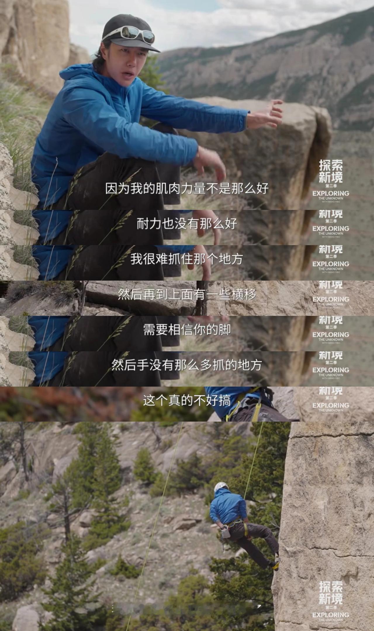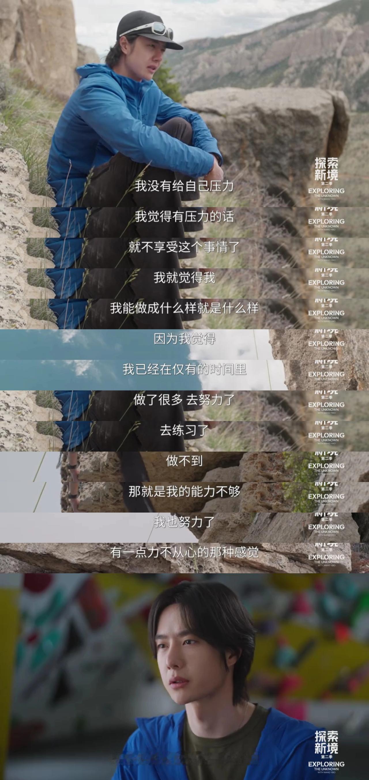 “接受失败是成长的一部分”,王一博内核之稳定,内心之强大和通透,真的值得太多人尤其当下的年轻人去学习。 “我今天完成不了,我可以过段时间再继续完成。我现在完成不了,我再怎么急也是一样完成不了的,我能力就是在那里,去试一试就好” “我没有给自己压力,我觉得有压力的话,就不享受这个事情了。”“我已经在仅有的时间里做了很多,去努力了去练习了,做不到,那就是我的能力不够,我也努力了,接受失败是成长的一部分吧。” 第一天没做到,那就暂时放下调整状态,认真总结复盘,然后第二天就成功拿下新线路!突破了自己的极限!——我刚才爬的很开心! 王一博 王一博探索新境2