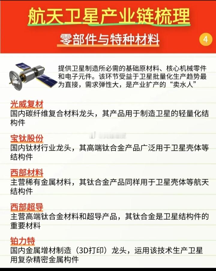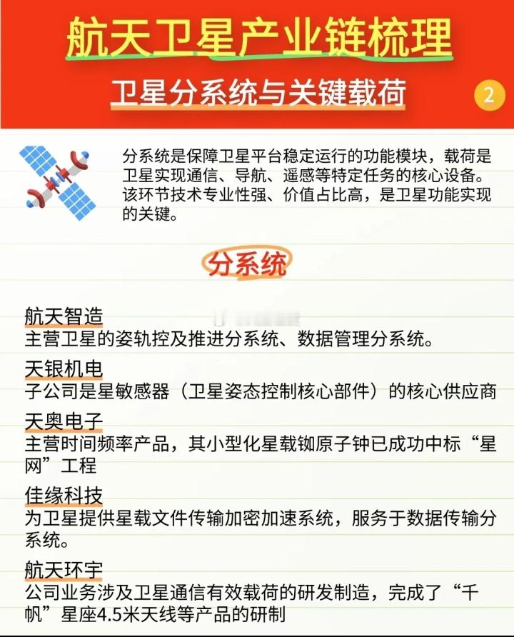 航天卫星产业链核心标的一、卫星制造与核心配套$中国卫星 sh600118$ :卫星总体设计与制造核心平台$航天电子 sh600879$ :航天测控、导航、微电子系统主力配套商$天银机电 sz300342$ :卫星姿态控制核心部件供应商二、地面设备与终端海格通信:军用卫星通信终端与芯片龙头华测导航:高精度卫星导航装备领军企业振芯科技:北斗核心芯片与终端供应商三、卫星运营与空间信息服务航天宏图:卫星遥感与地理信息软件龙头中科星图:数字地球产品与空天信息服务平台中国卫通:我国唯一商用卫星电信运营商四、关键材料与部件菲利华:航空航天石英纤维独家供应商宝钛股份:航天用高端钛材核心企业以上内容仅供参考,不构成投资建议!