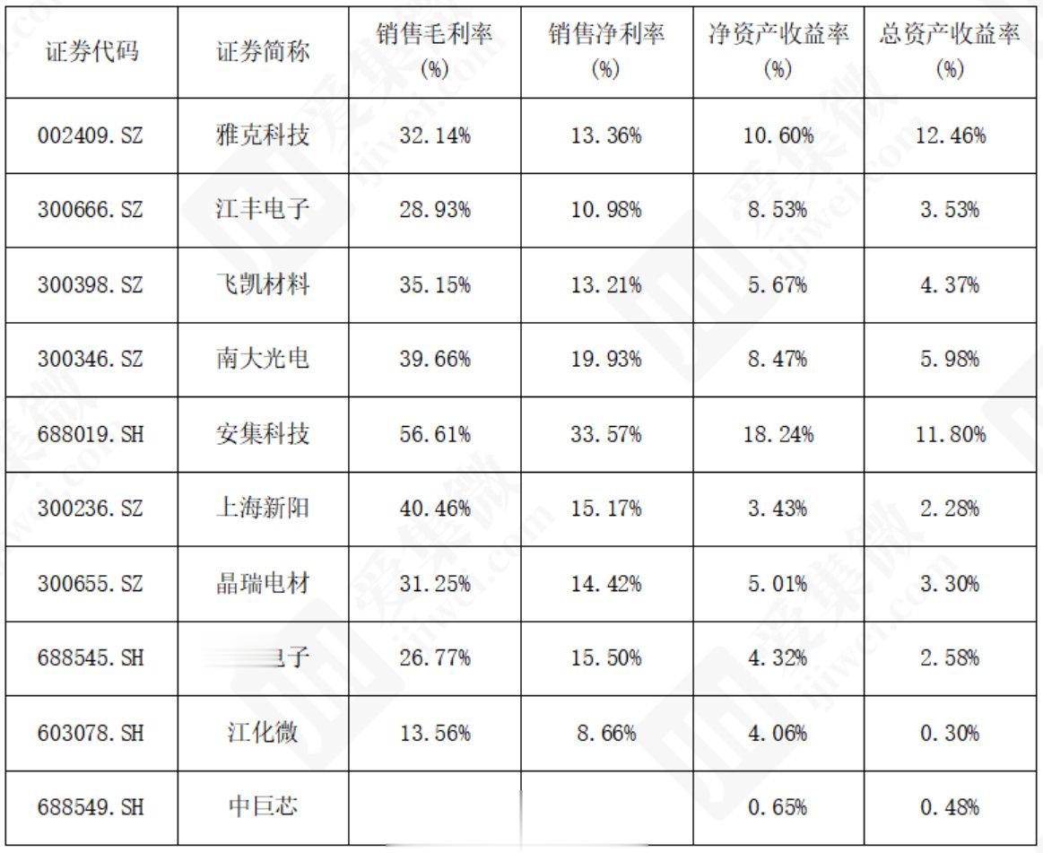 资产回报效率差异明显。净资产收益率方面,安集科技(18.24%)、雅克科技(10.60%)领跑;总资产收益率上,雅克科技(12.27%)、安集科技(11.80%)实现资产高效变现,江化微、中巨芯均不足1%,资产与利润匹配度低。销售净利率方面,安集科技(33.57%)和南大光电(19.93%)表现突出,江化微、中巨芯则因费用高企或盈利未释放,净利率处于低位。