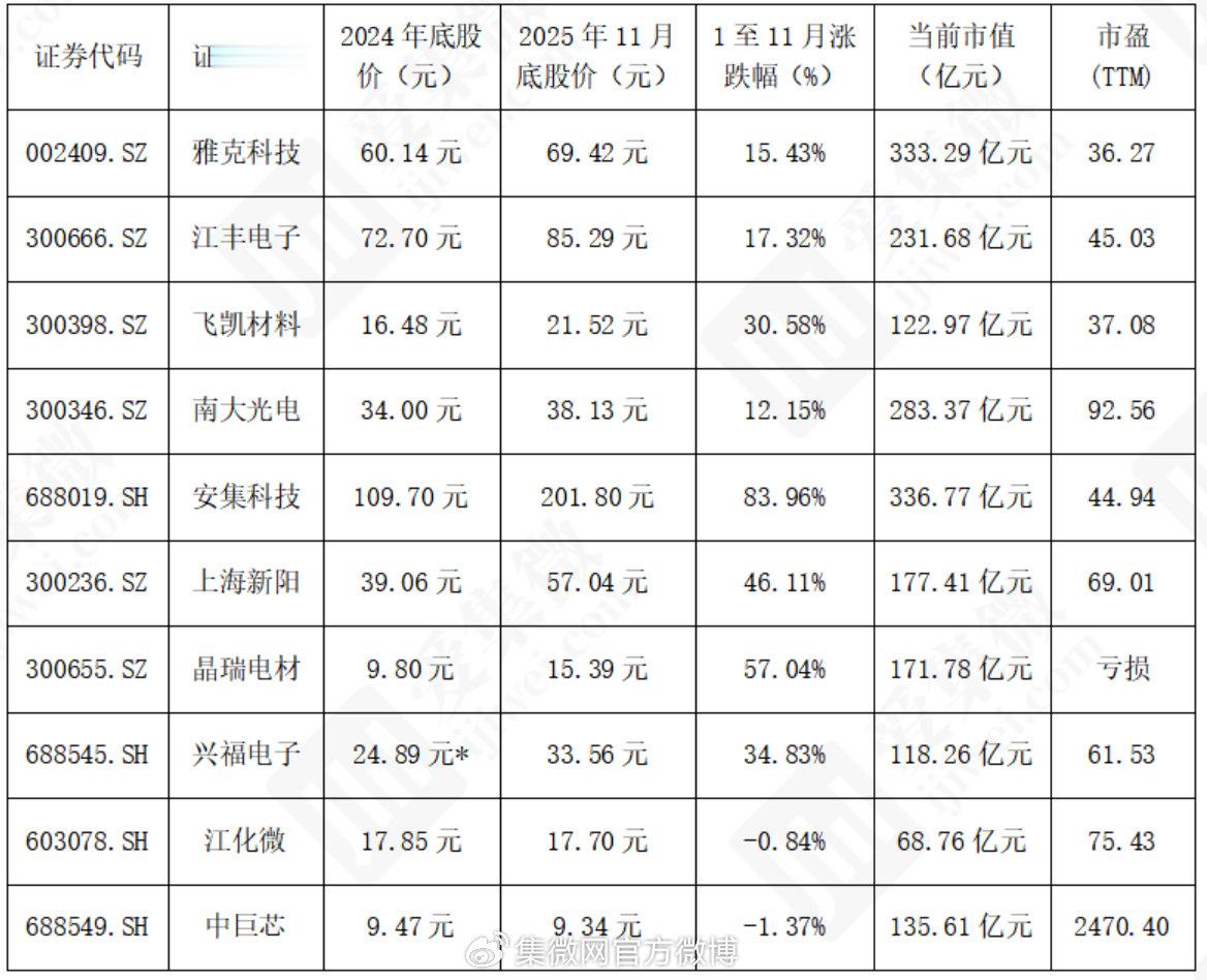 2025年1-11月,十家企业股价涨幅差距明显。安集科技(83.96%)、晶瑞电材(57.04%)涨幅居前,核心受益于业绩爆发与行业红利;上海新阳(46.11%)、兴福电子(34.83%)依托业务突破实现稳健上涨;雅克科技、江丰电子等涨幅温和,受业务基本面与资金波动影响呈现震荡走势;江化微(-0.84%)、中巨芯(-1.37%)小幅下跌,分别受市场竞争与盈利规模制约。