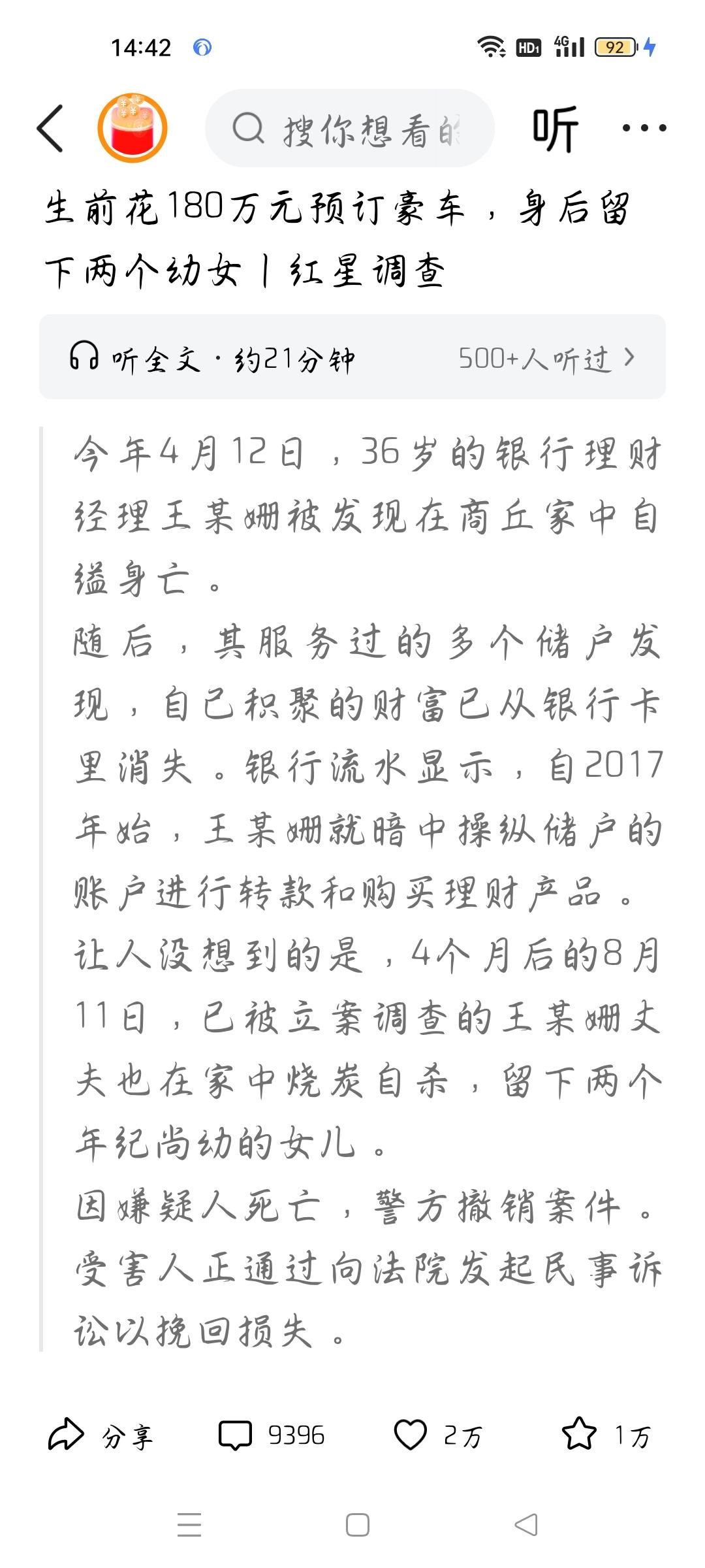 36岁银行女理财经理和其丈夫先后自杀,我想说 据红星新闻报道,36岁银行理财经理因挪用储户的资金达3000多万,今年4月自杀,其丈夫事隔四个月烧炭自杀,留下两位幼女,这是一起家庭悲剧,我想说,人没了,储户的钱怎么办?该女理财经理利用储户对她的信任,暗中操纵储户的账户进行转款和购买理财产品,我想说,一个人办不了,一定有相关人员协助,还有银行有严密的监管体制,个人认为,储户出现的损失,银行脱不了干系。各位条友认为呢?