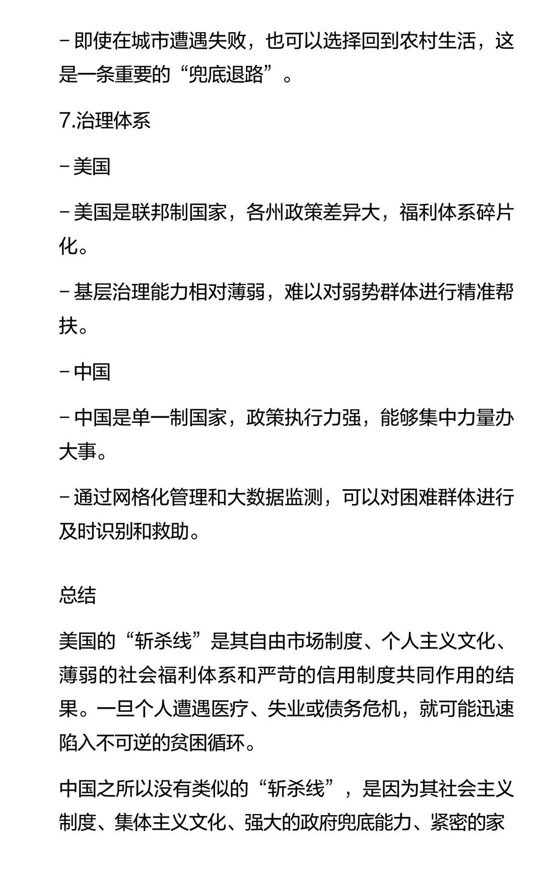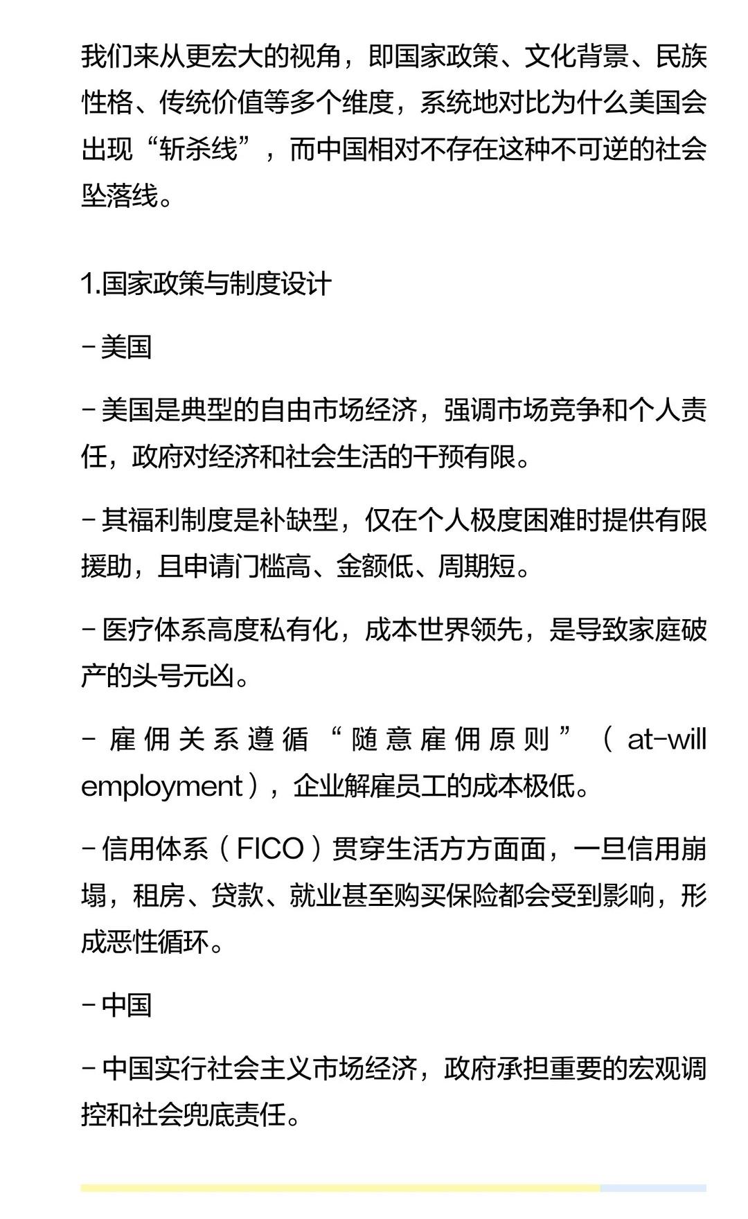 为什么美国有斩杀线 美国的“斩杀线”源于自由市场经济、个人主义文化、弱福利体系和严信用制度,导致个人危机迅速恶化。中国通过社会主义制度、集体主义文化、政府兜底、紧密家庭网络和农村退路,构建多层次安全网,有效阻断风险传导。人类的终极问题 崇洋媚外是一种病 非生物因素 完全竞争市场 当代中国经济 国家兴亡匹夫有责 世界历史