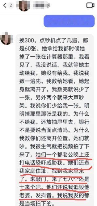 网友曝去银行取300元少5元还遭上门威胁?银行回应这是误会! 湖南娄底的这位网友真是倒了霉!去农商银行红日支行取300块现金,眼睁睁看着一张5块钱掉地上,被银行员工捡走就没给她。 她拍视频曝光后,更离谱的事来了。涉事员工家属不仅打电话恐吓她,还查到她住址并找上门,七八个人围着她说她诋毁人,吓得她赶紧报警。 警方协调后,银行回应说这只是个“误会”,就算行长后来道了歉,可这上门威胁的操作也太让人膈应了! 5块钱事小,但银行员工的做法、家属的嚣张态度,再加上银行这敷衍的回应,任谁遇上都得上火。大家去银行办业务有遇过类似的糟心事吗?银行 取钱