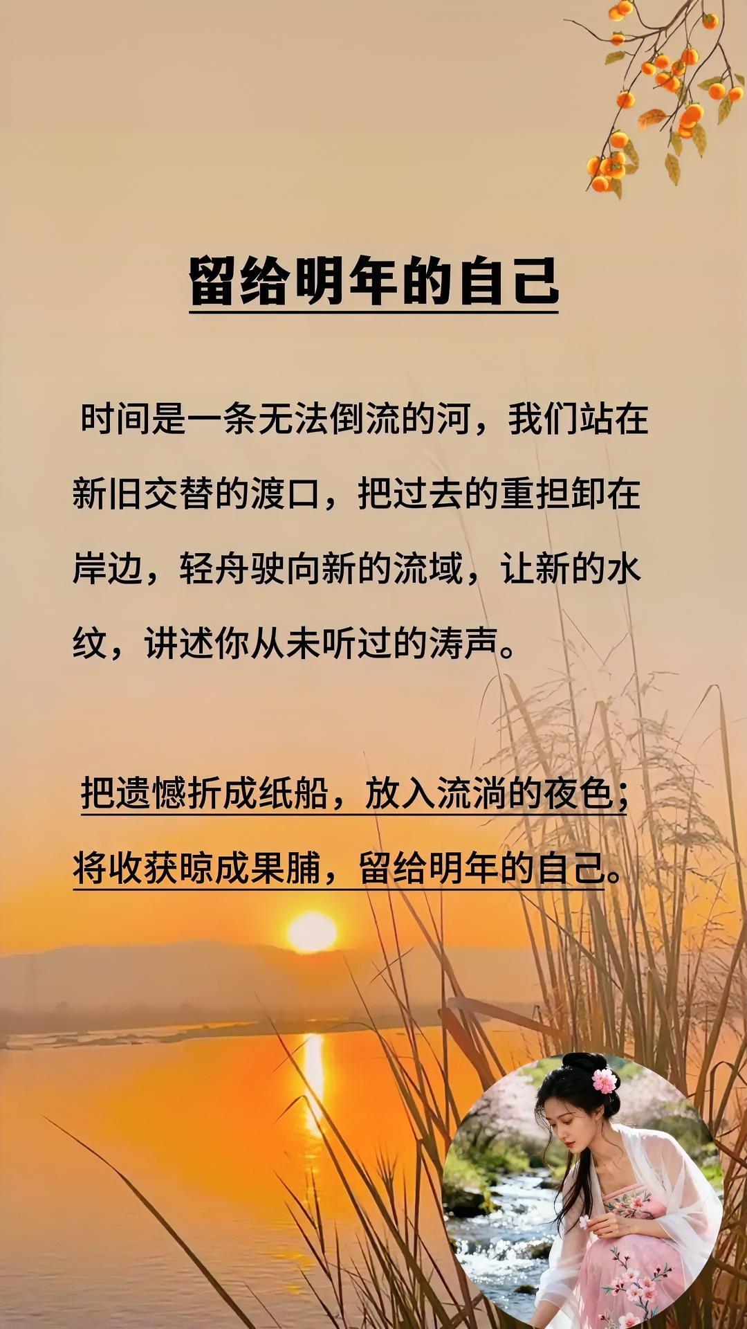 陪陪自己的人生! 冬天的味道写在风里, 人生的故事写在四季里。 光阴摇摇晃晃, 丢失的从来不是时光,而是念念不忘…… 曾经的快乐,是无忧无虑,如今的快乐,是知足常乐,未来的快乐,是健康平安,一生的快乐,是活的轻松! 愿2026,好运和幸福同在!平安和健康同行! 静静地陪陪自己 年尾随笔心情 对人生回忆