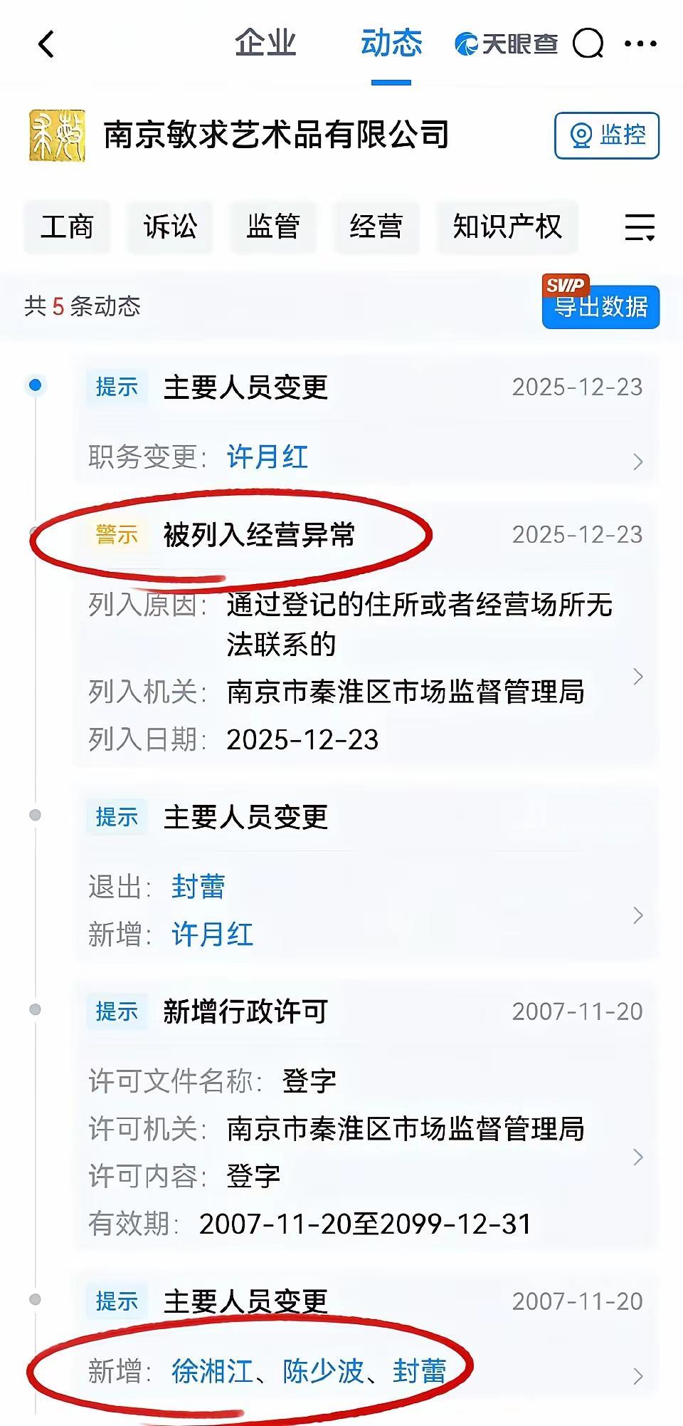 南京博物院原院长徐湖平这边刚出事, 后脚儿子的公司就“人去楼空”。 这时间卡得,简直比剧本还精准。 当天,他儿子徐湘江名下的“敏求艺术品有限公司”就被列入经营异常。 秦淮区市监局的理由很直白:登记的住所找不到人了。 所谓的“敏求”,听着文雅,干的买卖恐怕跟那个“雅”字沾不上边。 在这个圈子里,很多时候“艺术品”不过是权力的遮羞布,或者是变现的硬通货。 老子在台上,儿子的买卖风生水起;老子一旦落马,这买卖立马就成了烫手山芋,连夜提桶跑路都在意料之中。 这种“父子联动、权力变现”的戏码,在文物圈其实不算新鲜,但徐家的操作还是透着股急功近利的潦草。 公开信息显示,“敏求艺术品”注册于2005年,刚好是徐湖平升任南博院长的第三年。 经营范围直接瞄准“艺术品收购、销售、展览”,跟南博的核心业务几乎是无缝衔接,很难让人不联想其中的关联。 说白了,这公司更像个“权力中转站”。 老子在博物馆里掌着文物鉴定、调拨的大权,儿子在外面开着艺术品公司,一来二去,公共文物就有了“合法”流入私人腰包的通道。 之前闹得沸沸扬扬的仇英《江南春》,不就是从南博调拨到文物商店,再低价流入市场的吗? 文物圈的“雅贿”和利益输送,向来披着文化的外衣。 一件字画、一件瓷器,定价本就没有绝对标准,再加上“鉴定为伪作”的操作空间,很容易成为权力变现的硬通货。 徐湖平任内,南博曾有多件“虚斋旧藏”被定为“赝品”后流失,背后很难说没有类似的利益链条在运作。 有意思的是,我国《公职人员任职回避规定》早就明确,公职人员的亲属不得从事与其职权相关的营利活动。 但徐湘江的公司不仅开了,还开了近20年,直到徐湖平被带走才应声“跑路”,这背后的监管缺位耐人寻味。 从市监局的公告来看,这家公司的“人去楼空”更像有备而来,连基本的善后都懒得做。 回头看,“敏求”这个名字取得确实讽刺。 “敏而好学,不耻下问”的追求,变成了“敏于钻营,求利为先”的算计。 在文物收藏圈,“虚斋”庞莱臣的旧藏之所以被奉为圭臬,不仅因为藏品珍贵,更因为庞家世代坚守的文化操守。 而徐湖平作为掌管这些国宝的“守门人”,却让儿子借着公共文化资源牟利,无疑是对这份操守的亵渎。 历史上,类似的“监守自盗”案例并不少见。 清末民初的故宫文物南迁中,就曾有官员利用职务之便,私藏珍贵文物倒卖海外;上世纪八九十年代,多家博物馆的“赝品调拨”事件,也让不少国宝流失民间。 但这些案例都证明,任何试图把公共文化财富据为己有的行为,终究会被历史清算。 如今徐湖平被查、公司跑路,只是这场“文物利益迷局”的开始。 那些通过非正常渠道流失的文物,还能不能追回来? 监管的漏洞该如何补上,才能不让“守门人”变成“盗墓者”? 你觉得,要守住博物馆里的国宝,最该先拧紧哪个“安全阀”?