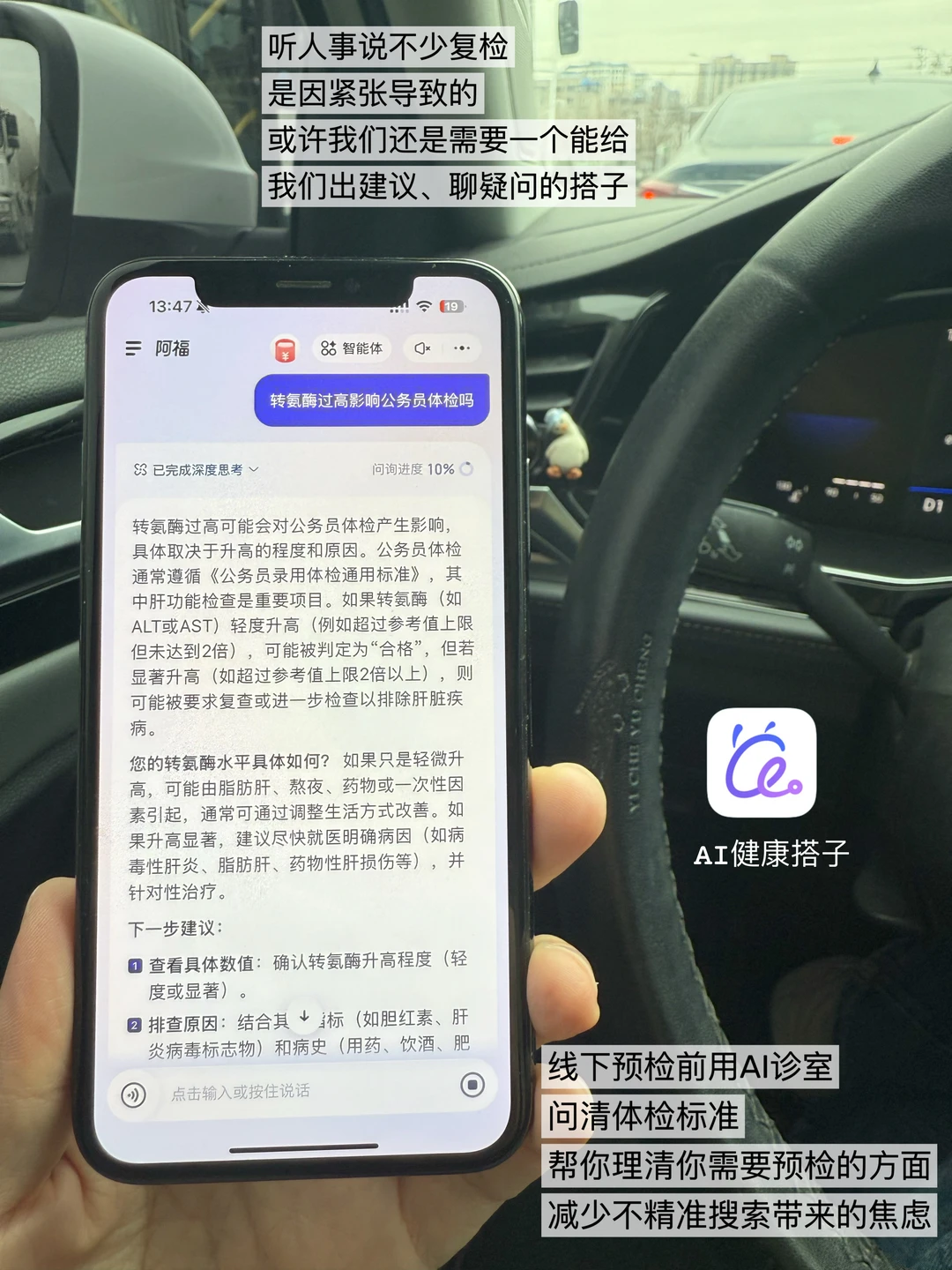听人事说不少复检是因紧张导致的,或许我们只是需要一个能给我们出建议、聊疑问的搭子,我试过后发现阿福AI健康助手很好用。分享下怎么用它帮我们参加公务员体检预检吧。