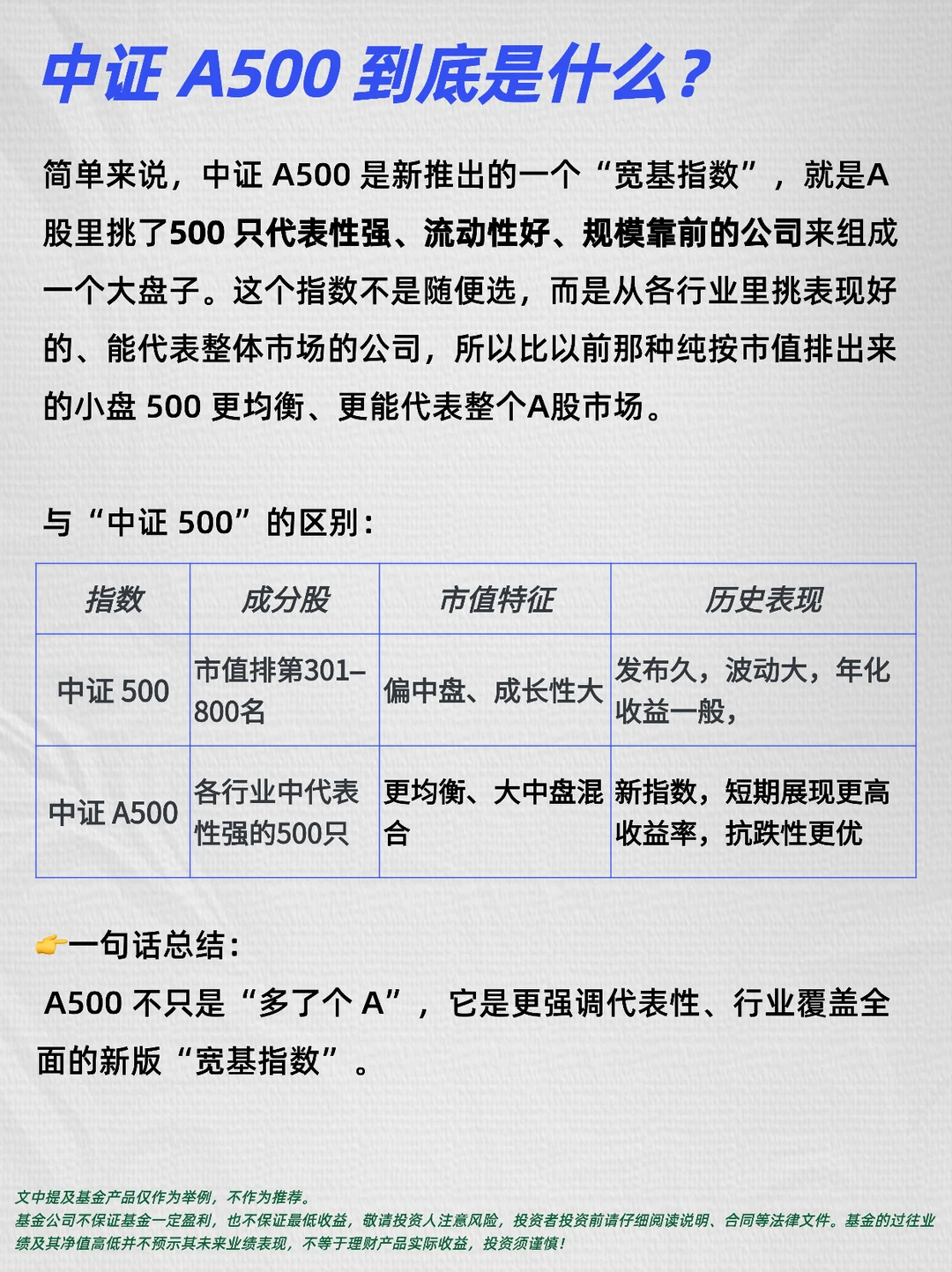 简单来说,中证 A500 是新推出的一个“宽基指数”,就是A股里挑了500 只代表性强、流动性好、规模靠前的公司来组成一个大盘子。这个指数不是随便选,而是从各行业里挑表现好的、能代表整体市场的公司,所以比以前那种纯按市值排出来的小盘 500 更均衡、更能代表整个A股市场。