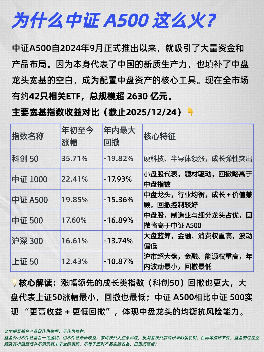 ✅中证 A500相比中证 500实现 “更高收益 + 更低回撤”,体现中盘龙头的均衡抗风险能力。