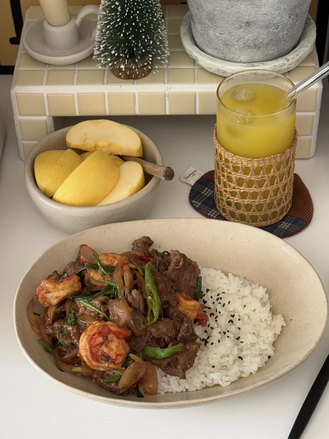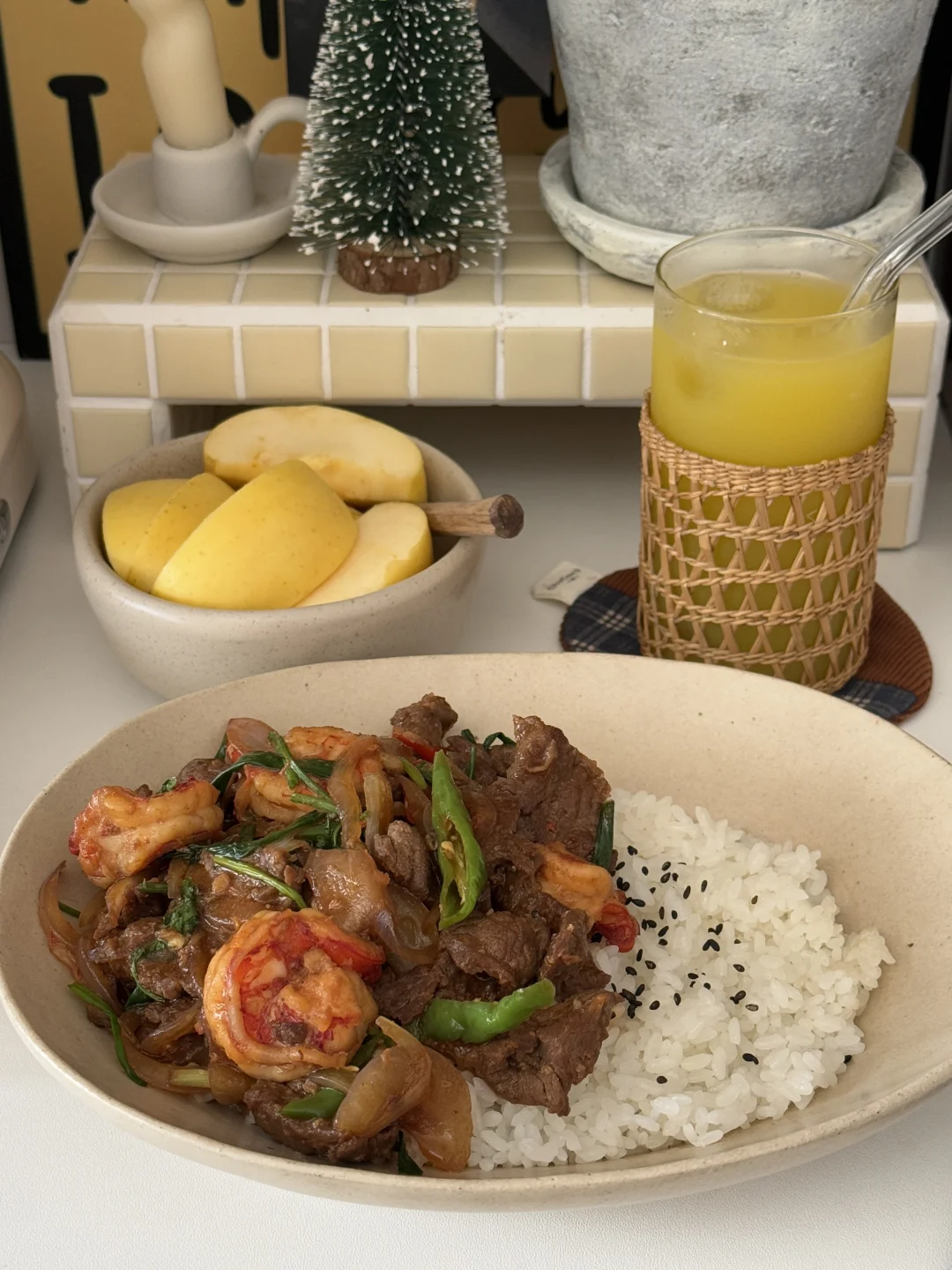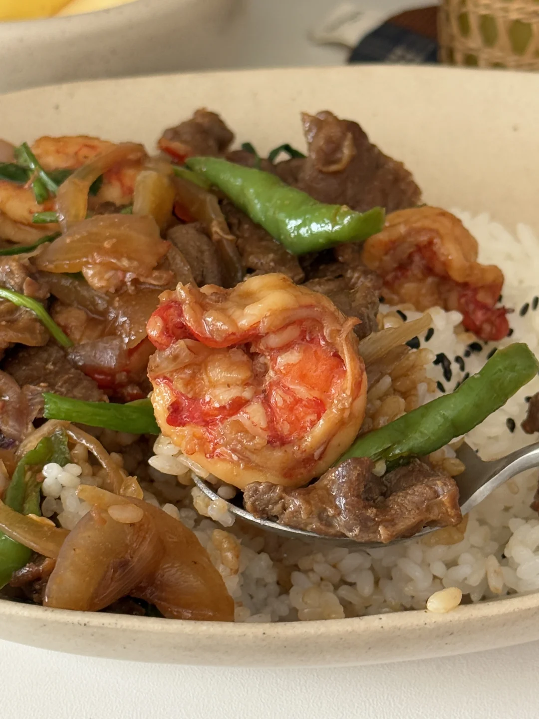 午餐一人食|一口沦陷的牛肉炒虾仁盖饭😋