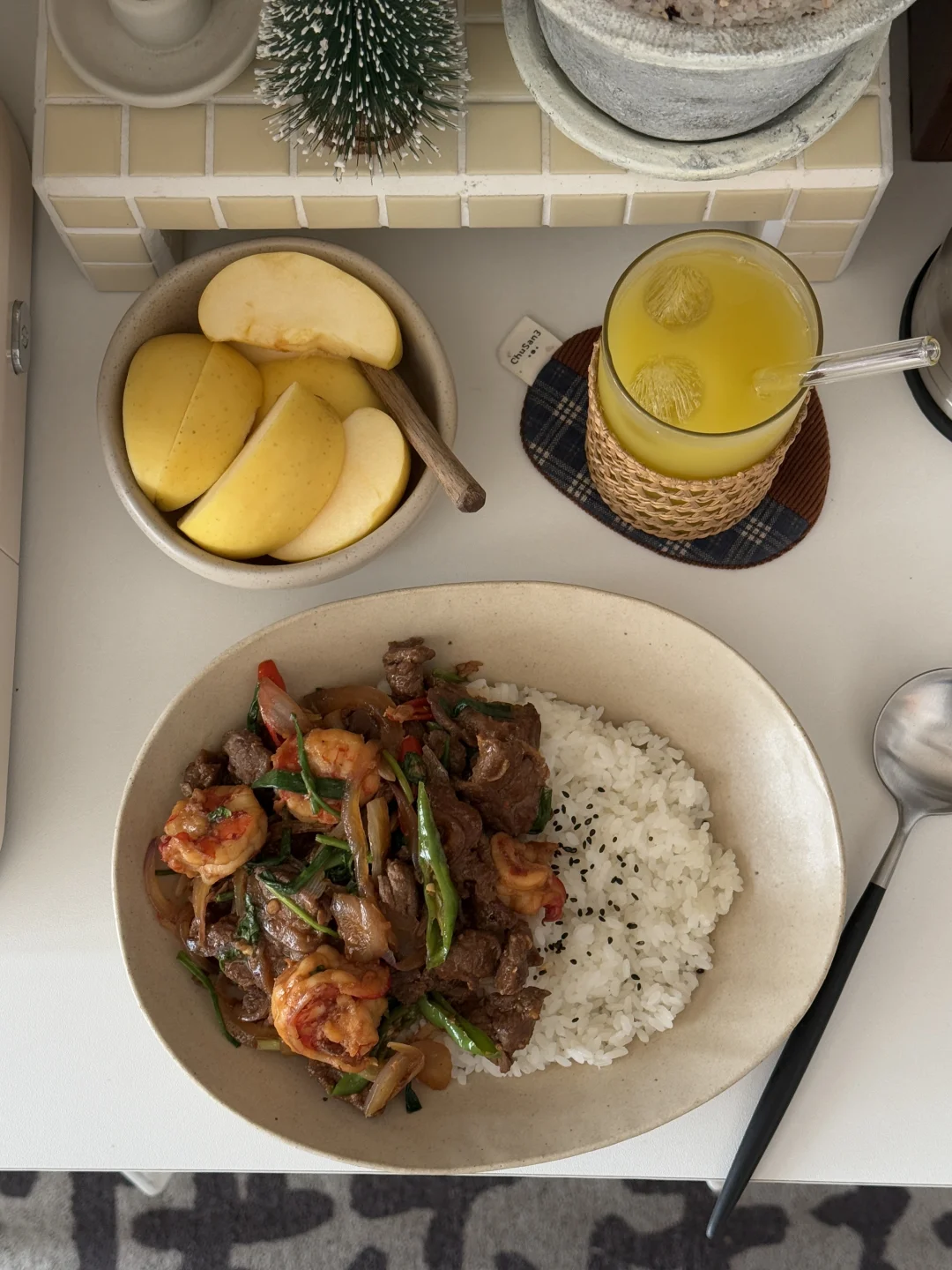 我的快手午餐 10分钟搞定🤝(煮饭不算 提前煮好的[暗中观察R] - 牛肉炒虾仁盖饭🥄 - 大火猛炒出来 非常有锅气 超下饭[烟花R]