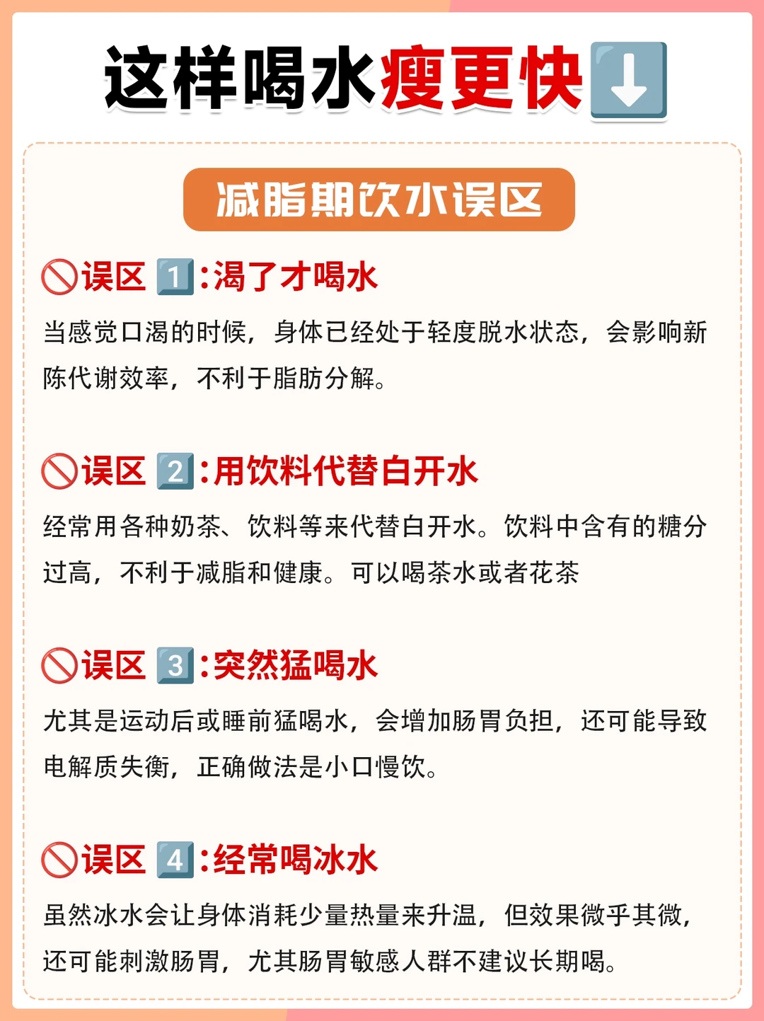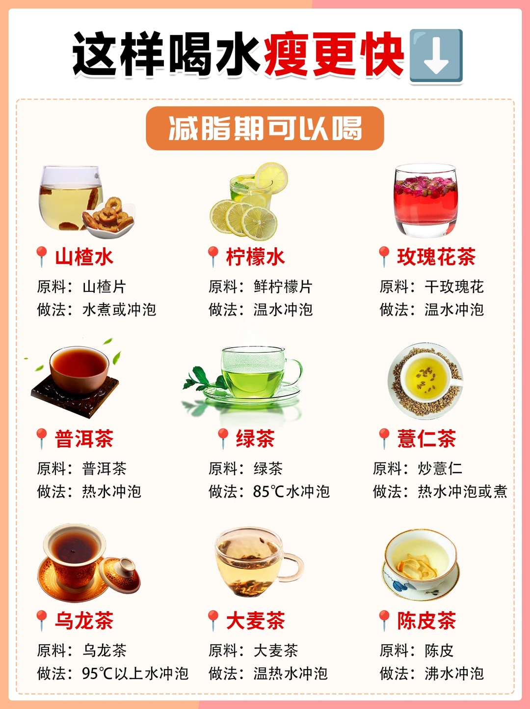 今天给大家分享一份适合减脂期的喝水时间表 赶紧看看你喝对了吗❓ 很多减脂期的宝宝喝白水喝不下,给大家分享几个减脂期可以喝的茶水⬇️ 📍山楂水、📍柠檬水、📍玫瑰花茶、📍普洱茶、📍绿茶、📍薏仁茶、📍乌龙茶、📍大麦茶、📍陈皮茶等 ⚠️减脂期不要用饮料、奶茶等代替水 . 🚫饮水误区 1⃣渴了才喝水 2⃣用饮料代替白开水 3⃣突然猛喝水 4⃣经常喝冰水 . ✅饮水指南 1⃣优先喝温水、常温水 2⃣小口慢喝 3⃣不要等口渴再喝 4⃣不用饮料代替水