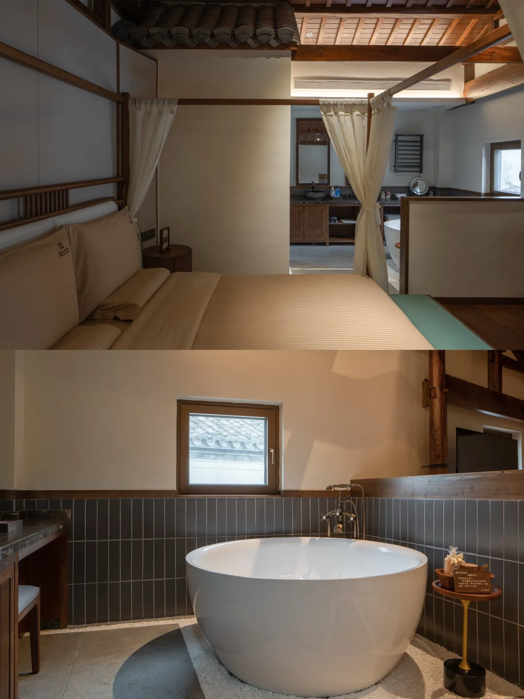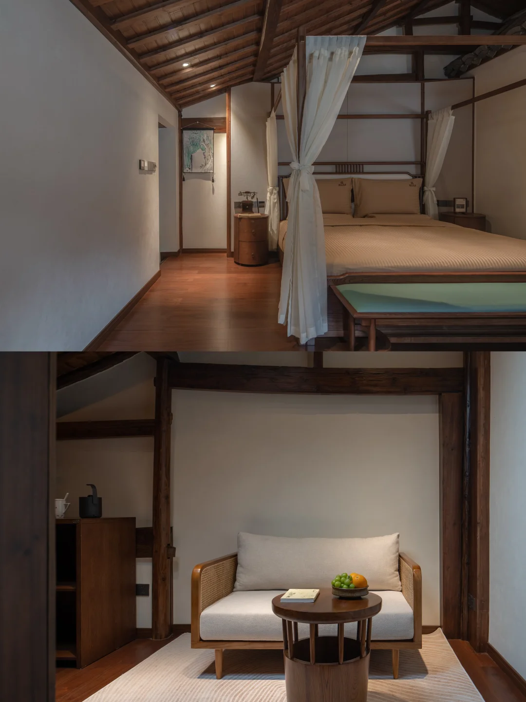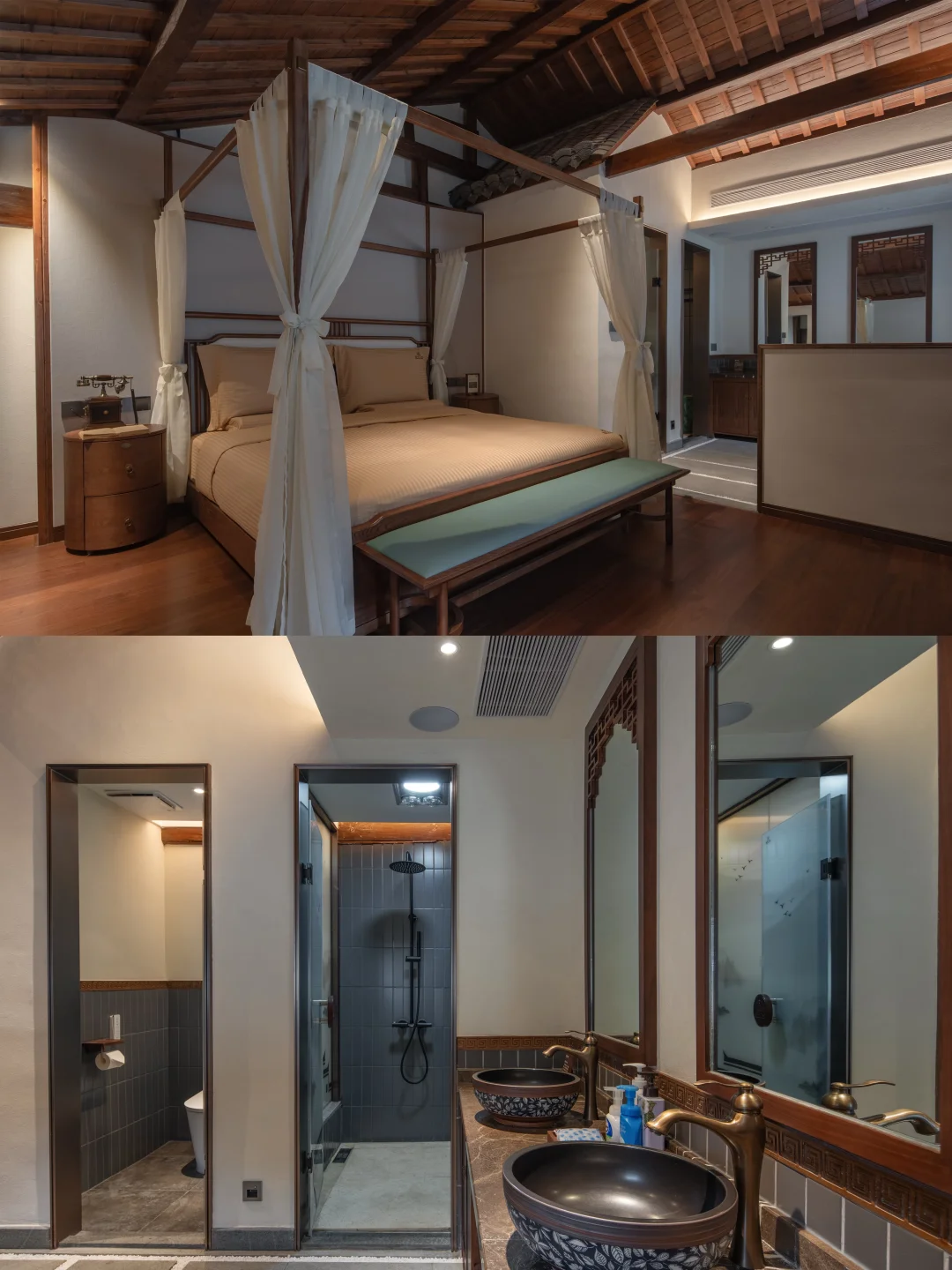 空间里融入了现代中式美学与智能化设计,安静、克制、有留白。房间尺度舒适,光线柔和,住起来非常松弛,是那种一进门就不想再出门的民宿。