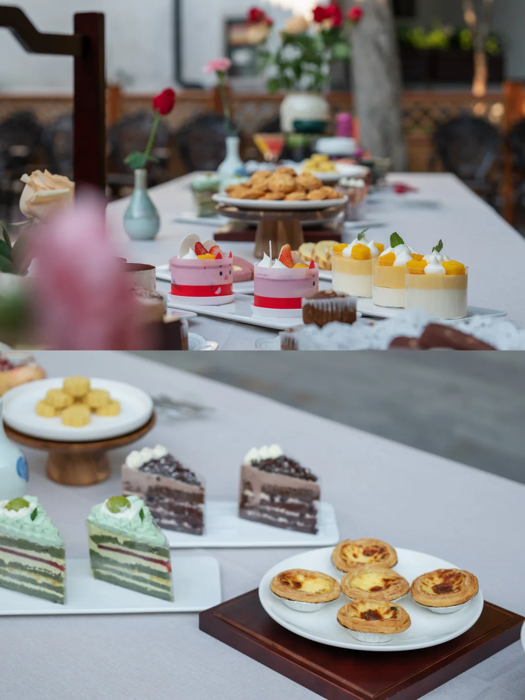站在屋顶天台喝下午茶,看古村屋顶层层铺开,远处是群山起伏,隐世感直接拉满。