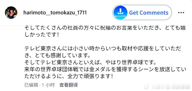 张本智和 251227 ins+X"东京电视台为我WTT总决赛夺冠举行了表彰仪式。本次WTT总决赛也由BS东京电视台进行了转播,非常感谢!此外,还收到了许多电视台员工们的热情祝福,我真的非常开心!从我小时候起,就一直承蒙东京电视台的采访和支持,我对此非常感激。而且,说到东京电视台,那当然就是世界乒乓球锦标赛了。在明年的世界乒乓球团体赛中,我将全力以赴,争取夺得金牌,希望能让电视台为大家转播我们夺冠的瞬间!"(机翻)