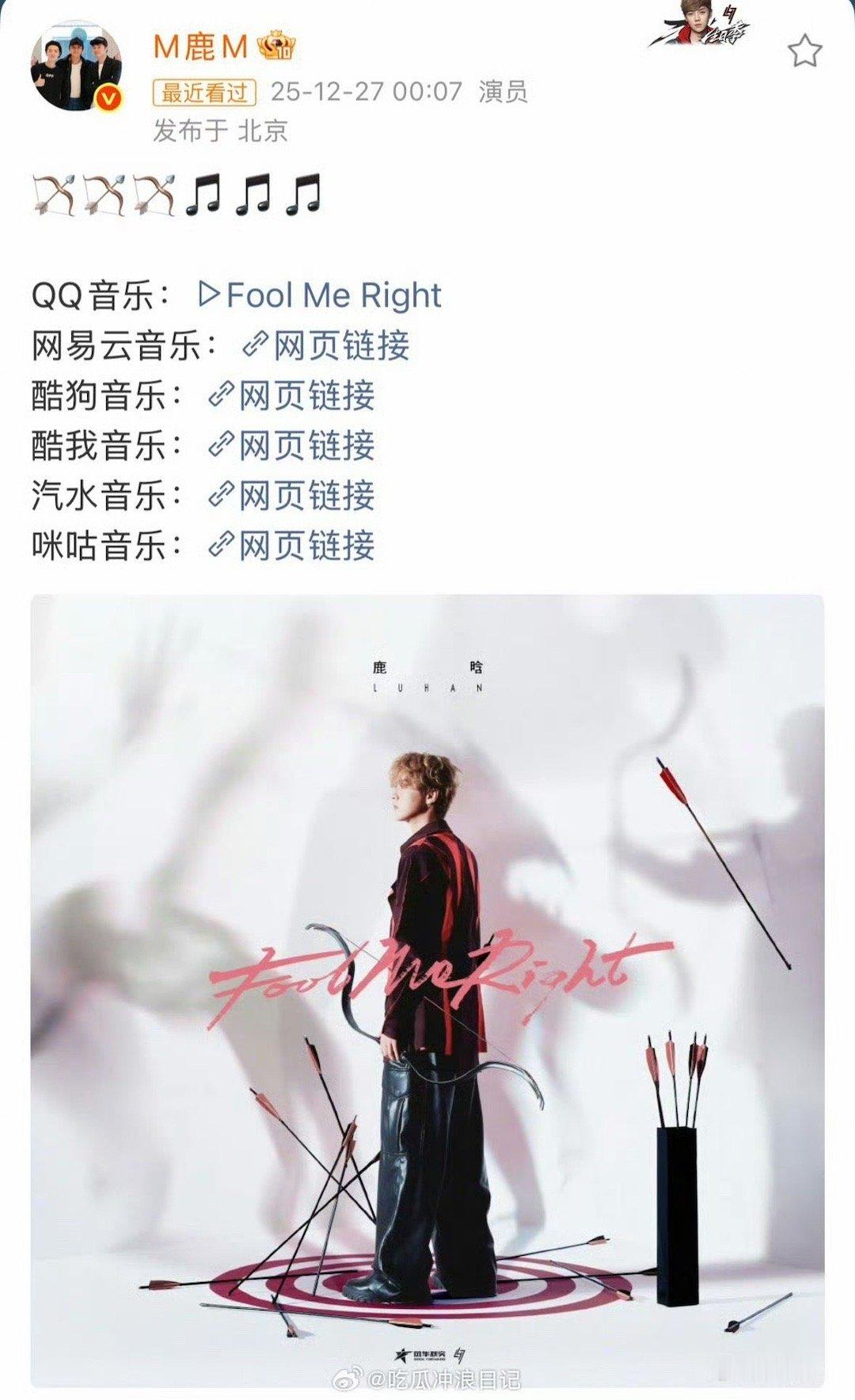 制作人鹿晗又上新了 制作人鹿晗交出第12首作品!《Fool Me Right》再次由他操刀,强劲节拍与温柔声线的碰撞,编织出如公路驰骋般的自由感。鹿制作人的音乐版图,正以高品质持续拓展。