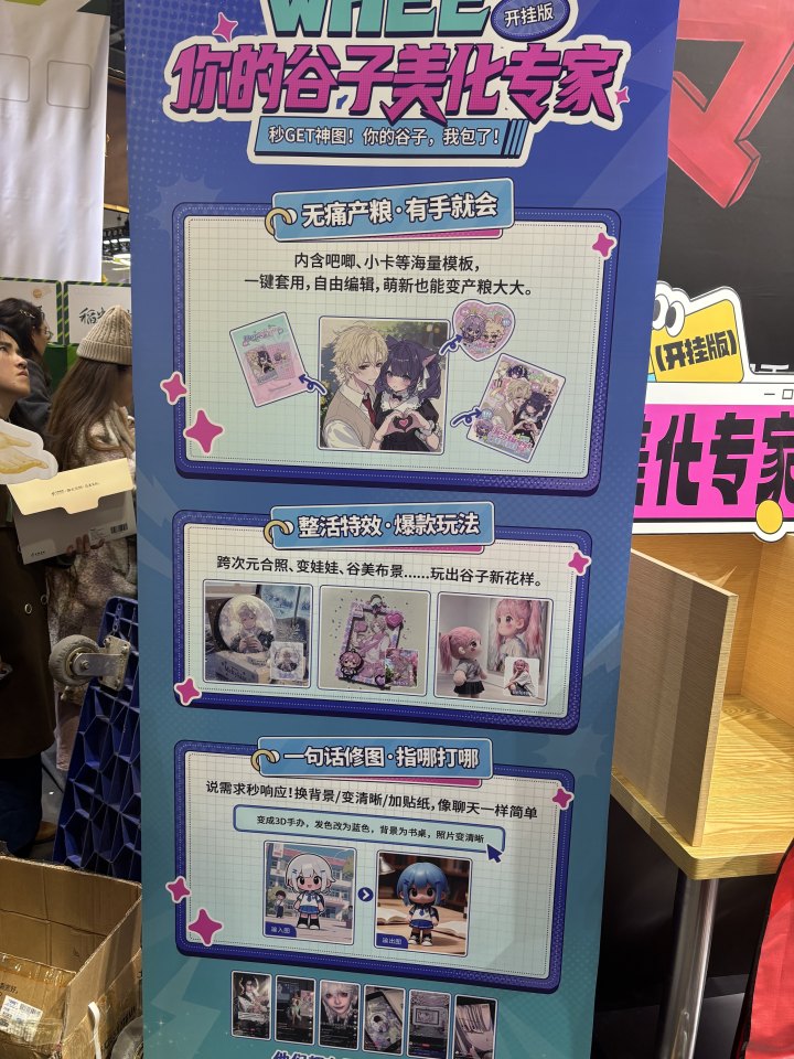 据现场工作人员介绍,本次参展美图带来了美图秀秀、Wink、WHEE、美图云修四款产品,尤其是WHEE是专门为二次元爱好者们拍摄谷子、周边而设计的APP,帮你秒get神图,“无痛产粮”。