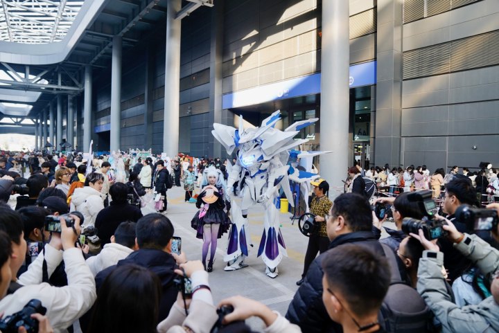 Lucina说,cp展开票那几天她刚好在澳洲旅游,亲友替她抢到票后,她提前一天结束了澳洲之旅,买了最快的机票回国。“昨天晚上刚落地萧山机场,cos服和道具已经提前寄到展馆了,早上排队进来就直奔场馆化妆间了。”