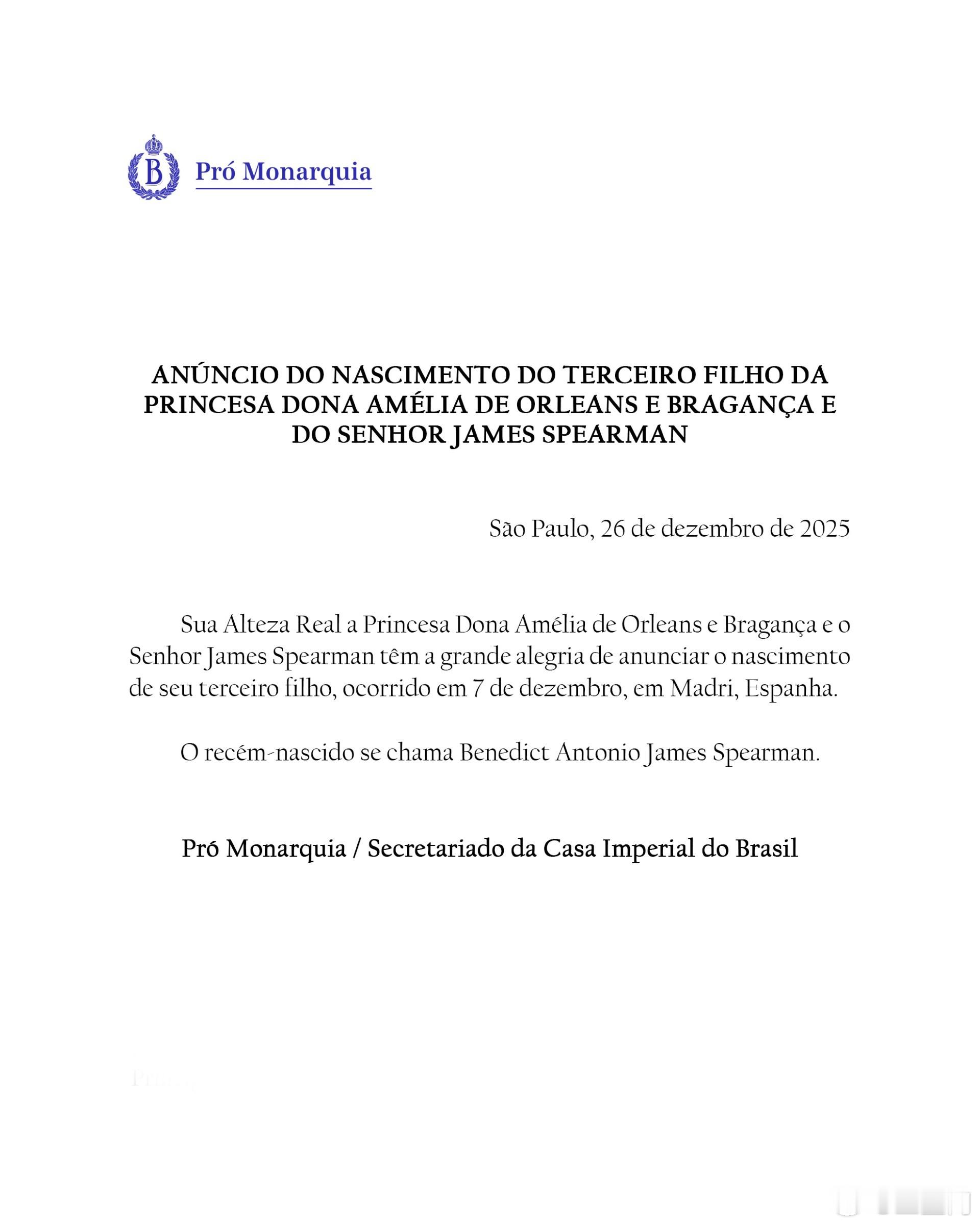 巴西王室 巴西公主阿梅利亚·玛丽亚和丈夫詹姆斯·斯皮尔曼迎来他们的第三个孩子Benedict Antonio James Spearman。