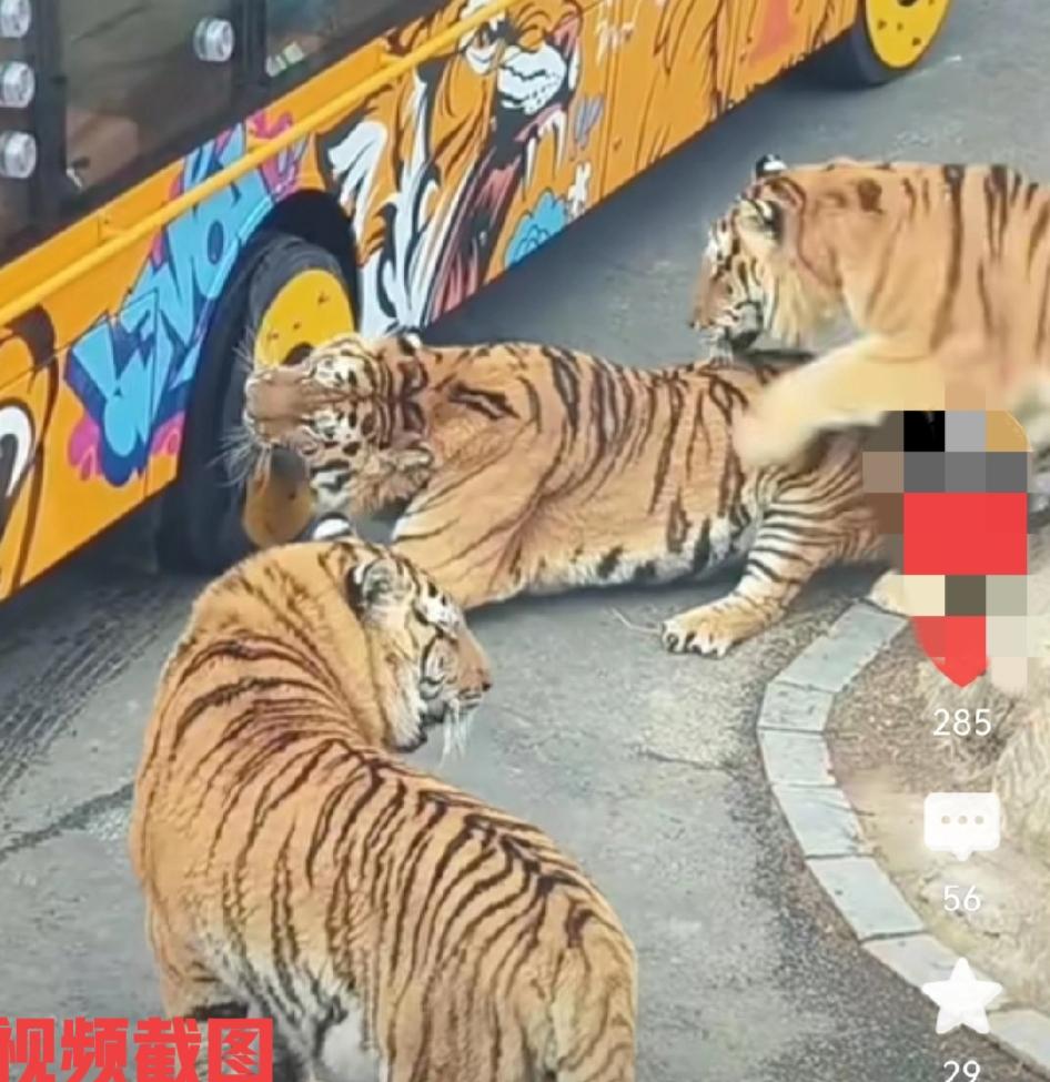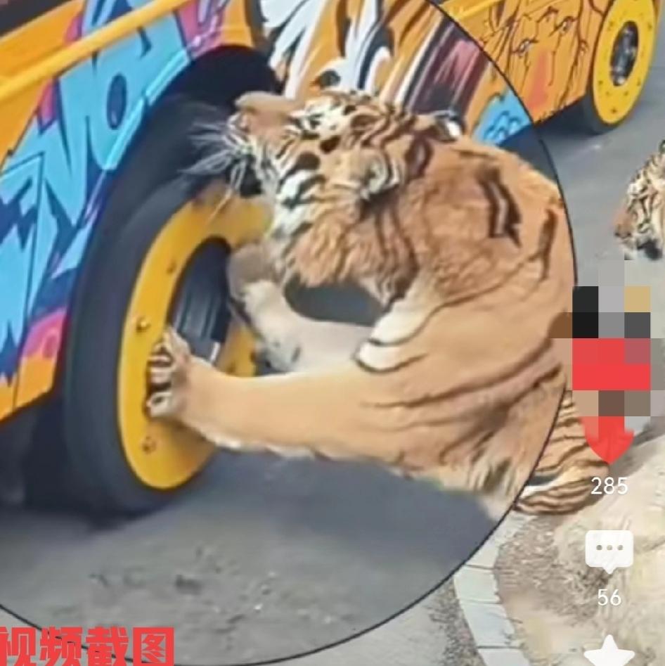 辽宁大连有家动物园的观光车在园内前行。 在经过东北虎园时,遇到有一只老虎上前对着车子轮胎就是一阵撕咬,结果把自己的牙给扣在轮胎上,一旁还有老虎要前来帮忙,似乎这只老虎压根没有领情,在自己的牙才松来后,还对着要帮忙的老虎又是一番龇牙。 这里看到老虎之间存在的不服气情绪,感觉在老虎的世界只有自己的威武,不需要其他什么来打扰,这里也有老虎的生活习性,让一场本来的生活习性,在此刻冒出了不一样味道,观光车上的游客也是看到老虎现场演绎出来的这一场景,别有生趣。 估计在观光众人的心里,还会猜想老虎怎么会盯着轮胎不放,老虎不是只对食肉感兴趣,其实这里轮胎对于老虎只是本性里的兴趣,察觉到不对时也会松开口,带给众人则是看到老虎带来的感官体会。 此刻在众人眼里会惊喜老虎习性,在老虎心里却表露出没有什么意思,白忙乎一场。