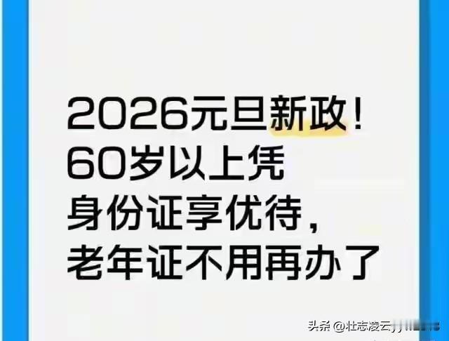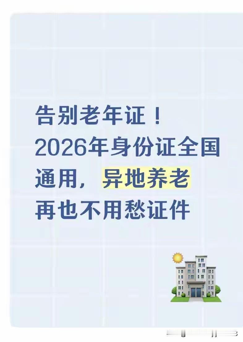2026起老人不用带老年证 身份证能享所有福利 我妈前阵子跟我吐槽 揣着老年证出门跟揣着宝贝似的 生怕丢了逛公园买不了半价票 有次忘带证 明明70岁了坐公交还得投币 回来念叨了好几天。相信不少家庭都有同款烦恼 老人异地帮子女带娃 本地老年证不认 办新证要跑好几个部门 证件丢了补办更折腾 少带一张照片都得白跑。 好消息来了 2026年1月1日起 全国正式推行身份证替代老年优待证新政 云南 福建 浙江这些地方已经抢先落地 浙江1405万老人 福建近70万老人早就尝到了甜头。现在只要身份证显示满60岁 刷证就能自动核验年龄 再也不用专门办老年证 不用年审 跨地区也能顺畅享受福利。 杭州的张大爷在外地帮女儿带孙 现在刷身份证就能坐免费公交 再也不用天天检查证件在不在口袋。济南的李阿姨去青岛旅游 以前外地老年证不好用 现在刷身份证就免了景区首道门票。不管是坐公交地铁 逛公立公园博物馆 还是去医院看病 一张身份证全搞定 65岁以上公交免费 70岁以上国有景区免票 医院还有优先就诊通道 不用跟年轻人挤长队。 异地养老的老人也不用愁 凭身份证加当地居住证 就能和本地老人享受一样的福利 医保报销也能异地结算。旧证也不用扔 还能继续用 身份证消磁了工作人员人工核对就行 行动不便的老人还能预约上门办证。 这波“减证不减福”的政策 真是说到了老人心坎里 也让子女少操心。你家老人有没有过忘带老年证被拒的经历 新政最让你省心的是哪点 快来评论区聊聊 记得转给爸妈 让他们也知道这个好消息~ 老人福利新政策 2026民生实事 身份证替代老年证 老年优待更方便 减证便民暖人心 信源:全国党媒信息公共平台、中华人民共和国民政部、新华网、浙江省老龄工作委员会办公室统计公报、福建省人民政府门户网站