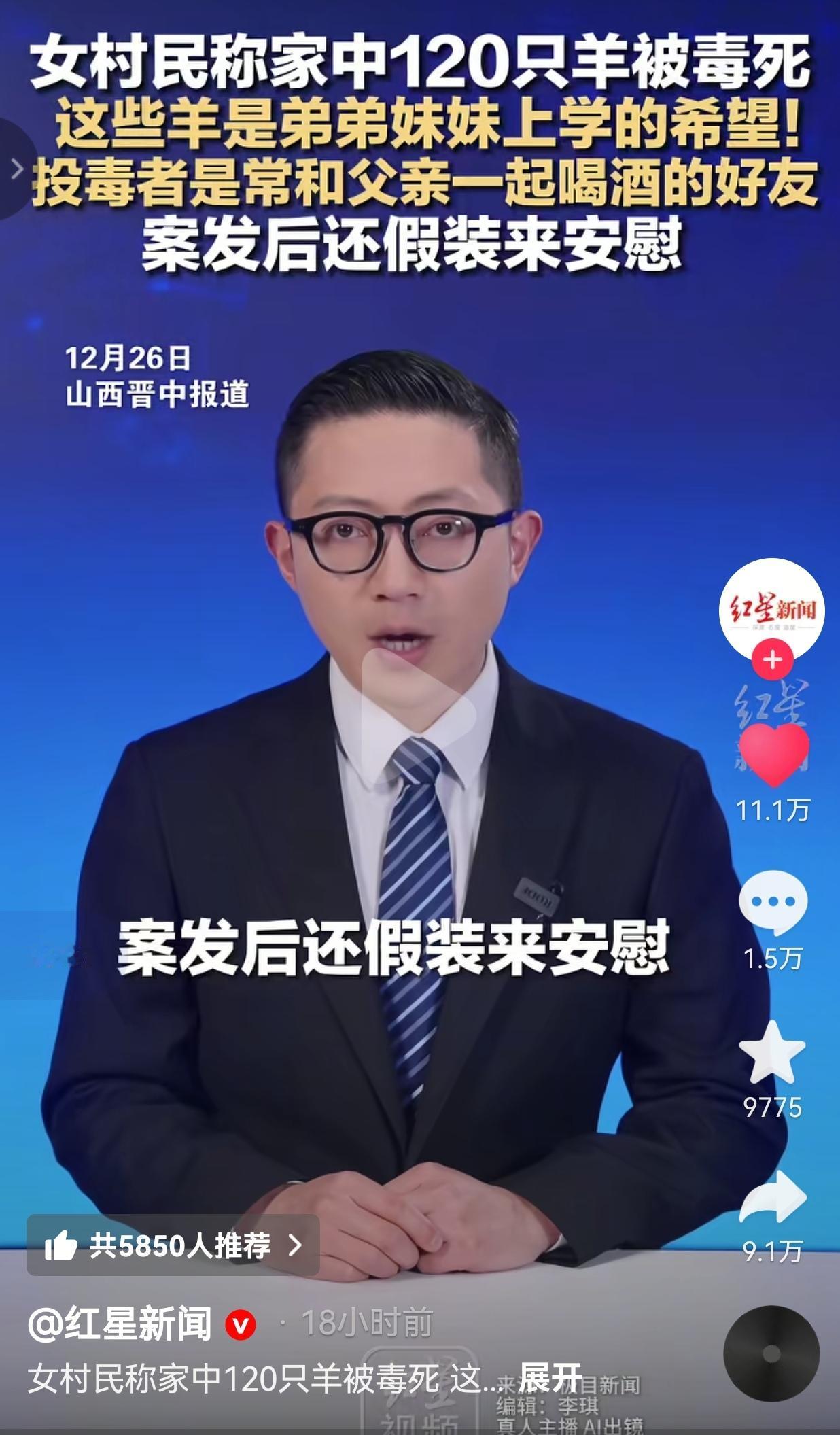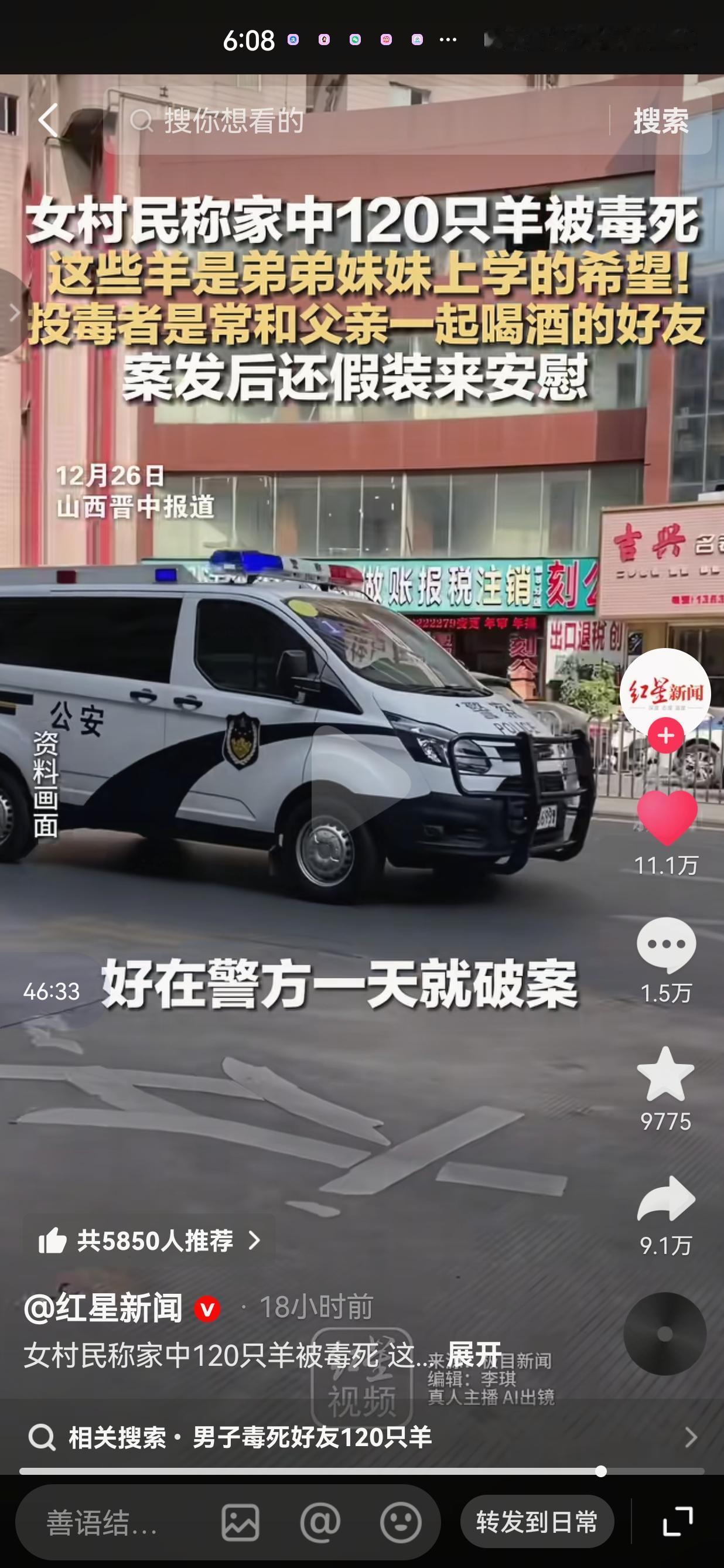 心思太歹毒了!山西晋中一村民家中120只羊被毒死,投毒者竟然是常和竟父亲喝酒的好友。令人细思极恐的是,案发后他竟然还假装过来安慰。网友:真的是后背发凉!背刺你的竟然是昔日好友,这让人太寒心了。 12月2日,山西晋中传出来个事儿,听得人头皮发麻。赵女士家养了200只羊,一夜之间就惨遭毒手。 120只直接被毒死,其中110只都是怀着崽的母羊,剩下80只也全掉了胎。 一共造成了38.8万的损失,这一大笔钱,可是她爹拉下老脸,挨家挨户跟亲戚朋友借才凑起来的家底,这群羊更是弟弟妹妹上学的全部指望。 真是应了那句老话,知人知面不知心,谁能想到,下这狠手的,竟是天天跟她爹喝酒的“铁哥们”武某! 武某这招太阴损了,把拌了毒药的玉米粒用草叶子盖着,偷偷藏在地里,专等羊群去吃。 赵女士一家子就靠养羊过日子,这群羊就是家里的顶梁柱,更是姐弟俩能走出村子、考上大学的盼头。 平日里,武某跟她爹称兄道弟,酒桌上拍着胸脯喊哥们,一转头就对这群羊下了死手,简直就是当面一套背后一套,笑里藏刀的主儿。 更让人恨得牙痒痒的是,出事儿之后,武某还装模作样上门安慰一把鼻涕一把泪的,活脱脱演了一出“猫哭耗子——假慈悲”的丑戏,那份虚伪劲儿,看得人心里直发寒。 一只羊,就牵着一家人的吃喝拉撒。120只羊惨死,直接砸烂了一个家庭的全部希望。 尤其是那110只怀了崽的母羊,连肚子里还没出世的羊羔,也没能逃过这一劫,这般狠心的做法,简直是斩草除根,毫无人性,彻底突破了做人的底线。 老话早就说了,“画龙画虎难画骨,知人知面不知心”,谁能料到,身边一起推杯换盏的熟人,背地里竟藏着这么一把歹毒的刀? 好在警方够给力,只用了一天的时间就把案子给破了,武某因为涉嫌危害公共安全罪被抓了起来,不过案子还在进一步调查中。 这事儿一曝光,评论区直接炸了锅。有人怒骂:“这哪是什么朋友,分明就是披着人皮的狼!” 也有的网友说:“到底是多大的仇怨,非要毁了别人一大家子的活路?太恶毒了!” 还有的网友说:“弟弟妹妹的学费这下彻底没着落了,这以后的日子可咋过啊!” 人心这玩意儿,真经不起利益和恶意的试探。都说“酒逢知己千杯少,话不投机半句多”,可这酒桌上的交情,压根抵不过藏在心底的坏心眼。平日里的热络亲近,也捂不住害人的祸心。 老话还说,善恶到头终有报,天道好轮回,苍天饶过谁?希望警方能早点查个水落石出,让武某为自己的恶行付出该有的代价,也给赵女士一家一个实公道。毕竟,谁都没资格,去毁掉别人活下去的希望。 大家觉得呢?欢迎评论区讨论留言。 信息来源:红星新闻