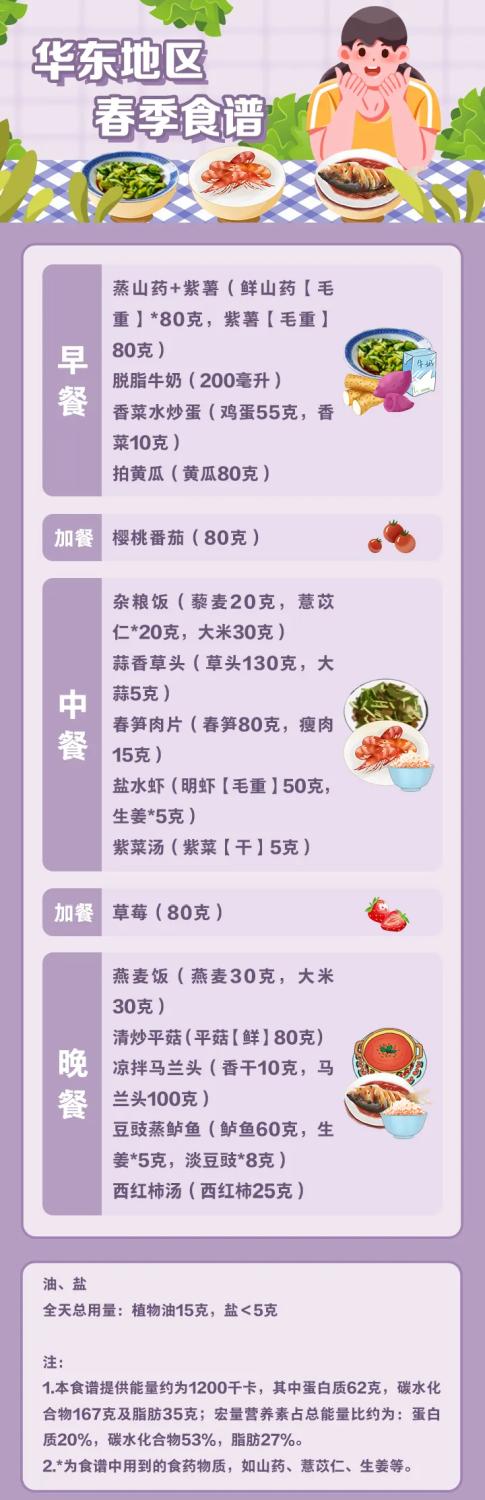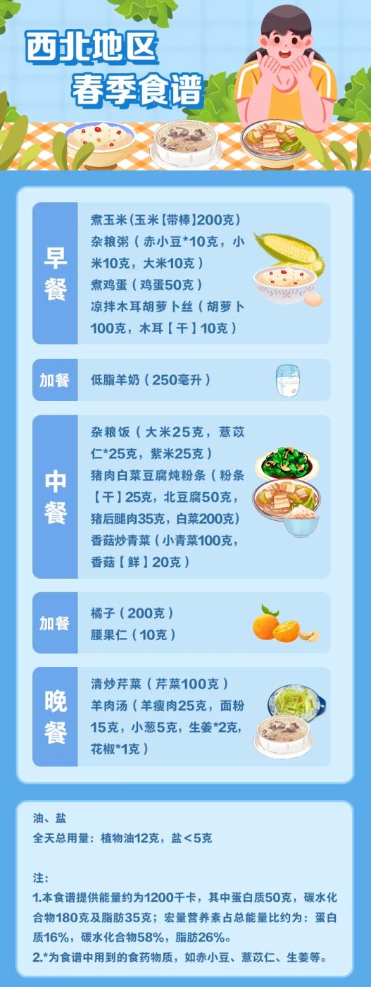 值得注意的是,这份指南还包含了全国不同地区的全天食谱示例,并备注了食谱的“总能量”。不同地区的使用者可参照食养原则和建议,结合食物交换表,根据具体情况进行合理搭配。以春季食谱为例: