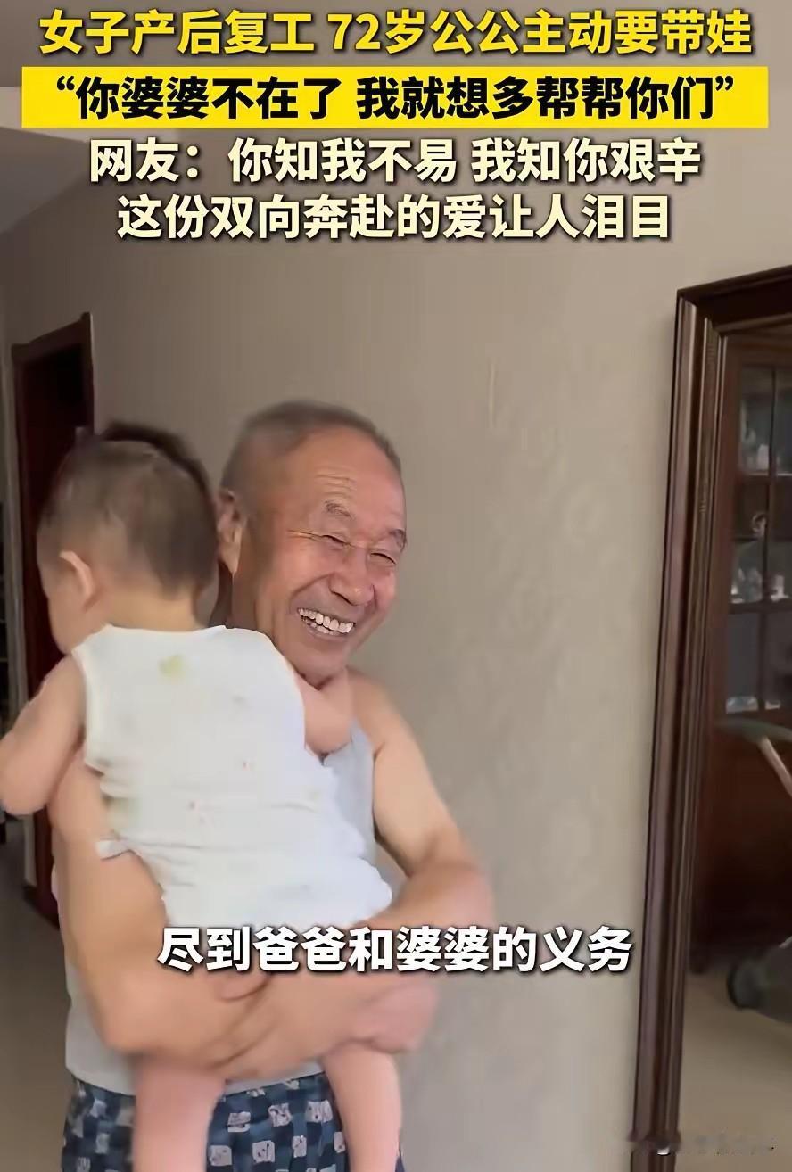 这样的公公全国罕见!陕西西安,女子产后准备复工,可始终放不下孩子,没想到,72岁的公公得知后,主动提出要带娃,而他给出的理由也是轻描淡写:你婆婆不在了,我就想多帮帮你!女子听到后感动的热泪盈眶。 陕西西安一位宝妈产后产假结束,眼看着复工的日子越来越近,心里的纠结一天比一天重,一边是好不容易打拼起来的工作,一边是怀里嗷嗷待哺的孩子,夜里常常盯着孩子熟睡的小脸发呆,翻来覆去睡不着,总担心孩子白天没人照看,怕小家伙饿了哭了没人懂,更怕自己不在身边,孩子会受委屈。 家里的情况她心里清楚,请专业育儿嫂开销太大,夫妻俩背着房贷车贷,实在难以承担,亲妈那边身体不好,也帮不上什么忙,婆婆早早就不在了,思来想去,这件事成了压在她心头的一块大石头,连上班前的准备都做得心不在焉。 让她万万没想到的是,72岁的公公把这一切都看在眼里,平日里老爷子话不多,每天就默默帮着家里收拾家务,早上出门买新鲜的菜,晚上等夫妻俩回来做上热乎饭菜。 这天早上,公公看着她对着孩子奶瓶出神,主动提出要帮忙带娃,话语说得朴实又平淡,只提了一句自己老婆子不在了,就想多帮帮孩子们,没再多说别的。 宝妈当下鼻子一酸,感动的眼泪忍不住掉了下来,她之前从来没敢想过让公公帮忙,毕竟老爷子年纪不小了,头发都白了大半,背也有些微微驼下去,本该是在家安享晚年的年纪,怎么能让他来受带娃这份累。 公公却丝毫没把带娃的辛苦放在心上,从决定带娃那天起,就把心思全都扑在了孩子身上,为了能科学照顾孩子,他特意让儿子帮忙找了育儿知识,戴上老花镜一点点钻研,把冲奶粉的合适水温、每天该喂几次奶、辅食该加些什么都记在小本子上,连孩子不同哭声代表的需求都摸得清清楚楚。 每天早上天不亮就起床,先去小区门口的早市挑最新鲜的蔬菜,回来收拾妥当,就等着宝妈和儿子出门上班。 夫妻俩前脚刚走,他就开始忙活孩子的早饭,冲奶粉时先倒水再放奶粉,双手捧着奶瓶来回搓匀,从不用嘴尝温度,而是滴几滴在手腕上试好才喂给孩子,喂完奶还会轻轻抱着孩子拍嗝,动作慢慢悠悠,格外小心。 白天的时光里,老爷子的脚步就没停过,孩子醒着的时候,他会抱着在屋里慢慢走动,给孩子讲些平日里听来的小故事,或者带着孩子在阳台上晒晒太阳,教孩子认识窗外的花草树木,孩子哭闹的时候,他就耐心哄着,轻轻拍着后背哼着不成调的小曲,从没半点不耐烦。 到了中午给孩子做辅食,他会把食材洗得干干净净,细细剁成泥状,当天做当天吃,从不会给孩子吃隔夜的东西,喂饭时让孩子乖乖坐在餐椅上,不追着喂也不哄着喂,慢慢帮孩子养成好习惯。 孩子拉了尿了,他总能第一时间发现,赶紧用温水帮孩子擦洗干净,晾干小屁股再换上干净尿不湿,每天定时给孩子洗脸擦面霜,护理得比年轻人还要细致。 中午孩子午睡,他也不敢走远,就坐在床边的小马扎上守着,生怕孩子踢被子着凉,也怕孩子睡得不安稳,有时候自己困得眼皮打架,也强撑着不肯去休息,手里还拿着育儿手册慢慢翻看,想着再多学些照顾孩子的法子。 下午天气好的时候,他会推着婴儿车带孩子去小区里溜达,婴儿车安全带系得牢牢的,随身带着保温壶、尿不湿和备用的小衣服,遇到邻居问起,就笑着说帮孩子们带娃,脸上满是欣慰。 傍晚宝妈夫妻俩下班回家,总能看到老爷子正陪着孩子在客厅玩耍,桌上摆着热腾腾的饭菜,孩子干干净净的,小脸上带着笑,身上的衣服也整整齐齐,看不到半点慌乱。 宝妈上班后,心里的牵挂从没断过,午休时总会忍不住给家里打个电话,每次都能听到公公说孩子一切都好,让她安心工作,不用惦记家里。 这样一位72岁的公公,用自己的行动默默为晚辈分担,把本该安享晚年的时光,用来为孩子们遮风挡雨,没有惊天动地的话语,只有日复一日的付出,把对家人的爱藏在每一个照顾孩子的细节里。 对此,你们有什么看法,欢迎评论留言~
