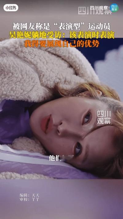 吴艳妮争议事件又加一 接受采访时突然躺地上 不过她虽然躺地上,还是回答了记者问题,还回应了被调侃是表演型运动员。 她说,“我没有什么偶像包袱,我就是一个普通人,只是多了一个技能。他们都说我是表演型运动员,所以在该我表演的时候,我得展现优势!”