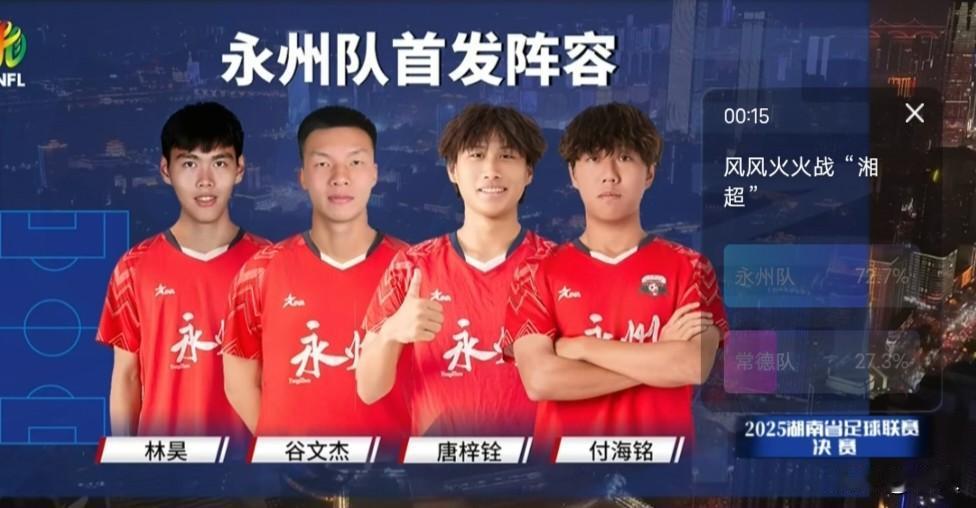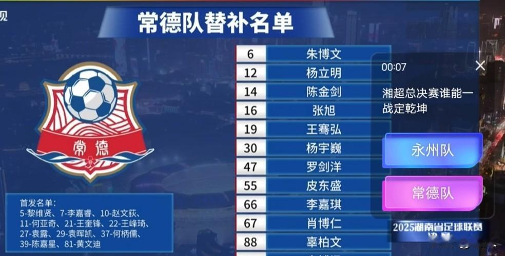 湘超决赛开战啦上半场0比0双方交战互杀都很拼想想为自已的家乡拿下冠军,第7分钟永州、第8分钟常德,都拿到角球,第15分钟常德队反击头球,太吓人了!祖公老子保佑了,18分钟永州反击成功,可惜打到球柱上,没关系!从开始40分钟之间,永州有6次打常德球门机会!传球双方都有失误,永州队传给常德、常德传给永州队球员脚下,双方队员高中生都表现不错,永州队员上半场拿了个黄牌、都到决赛了无大事,永州队流量王,在开幕歌曲中,有柳宗元节目、这点太棒了!永州第二现场、永州第N现场,都人山人海!今天天气不错。打球正好!期待下场永州队加油! 决赛正赛地:长沙贺龙体育中心(19:45,永州队VS常德队) 永州第二现场:永州市体育场(免费,15:00起入场,大屏直播) 永州第三现场:全市各县市区均设观赛点,如冷水滩湘江西路红舞台、零陵东山景区、道县文体中心足球场、双牌体育场等,均免费开放湘超 湘超2025决赛日 湘超永冲锋