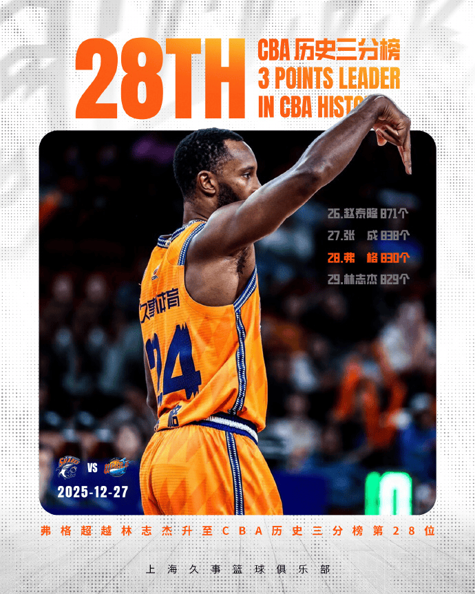 赛中,上海男篮发文:弗格生涯三分达830个,升至CBA历史三分榜第28位。