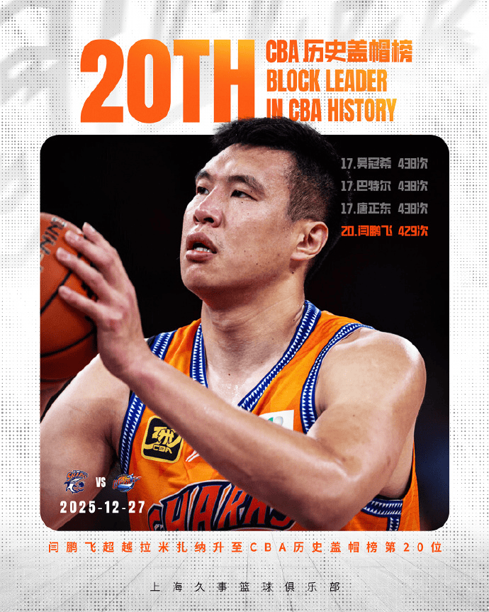 赛中,上海男篮发文:闫鹏飞盖帽数达429次,升至CBA盖帽榜第20位。
