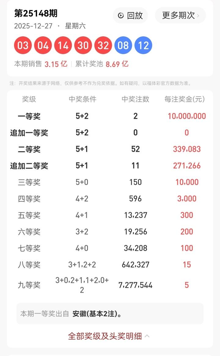 12月27号星期六,大乐透开奖号码揭晓:03、04、14、30、32—08、12。本期大乐透开奖号码前区红球开出了一组连号03、04号,开出了一组十进制同尾号04、14号,后区蓝球开出了08、12号组合其中08号是枚重号。 本期大乐透开奖号码前区红球大中小区号码都有分布比较均匀,没有重号开出。一等奖仅开出两注,单注奖金1000万元,没有追加一等奖开出。一等奖中奖分布:安徽中得两注基本一等奖。