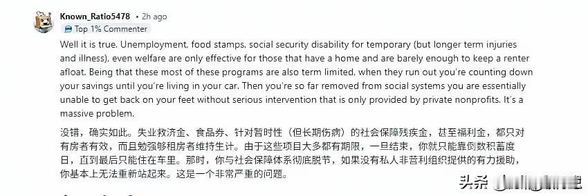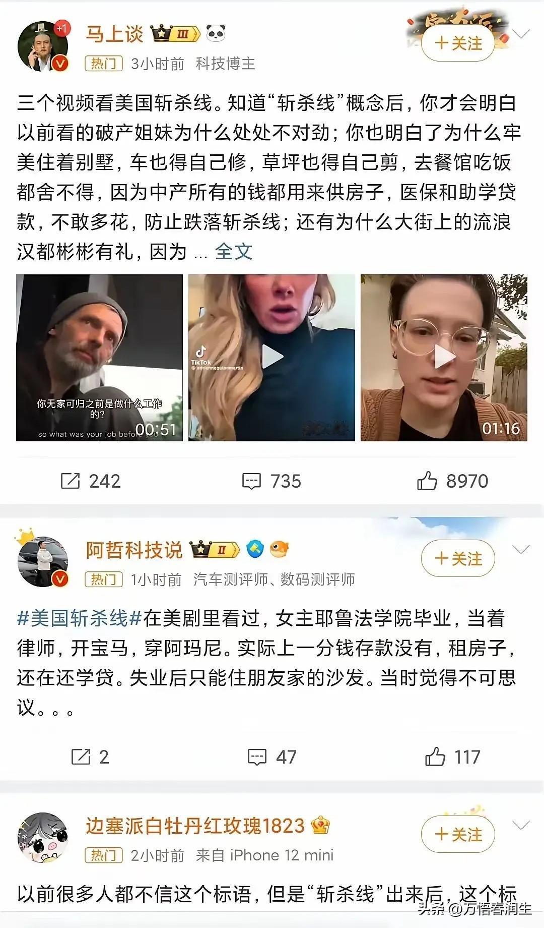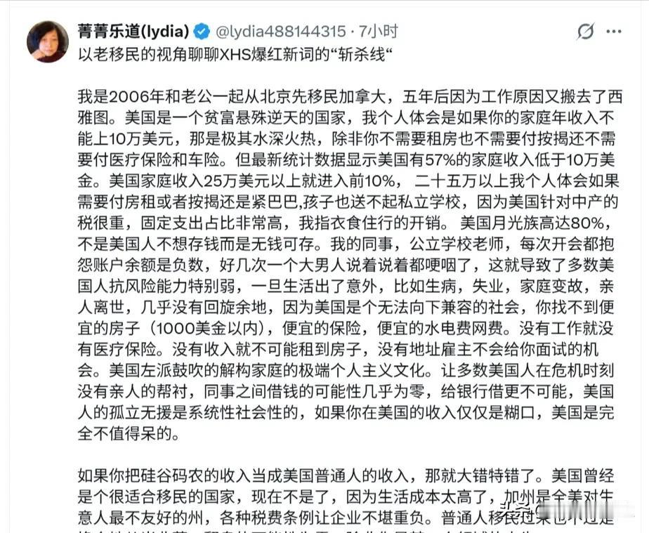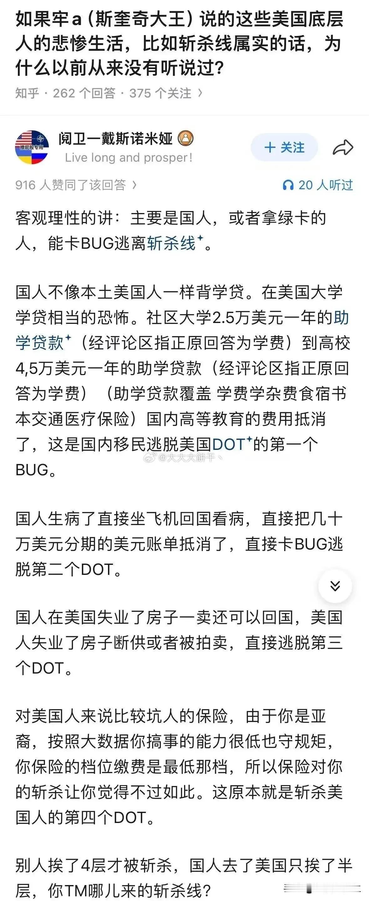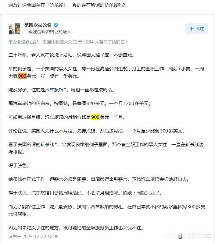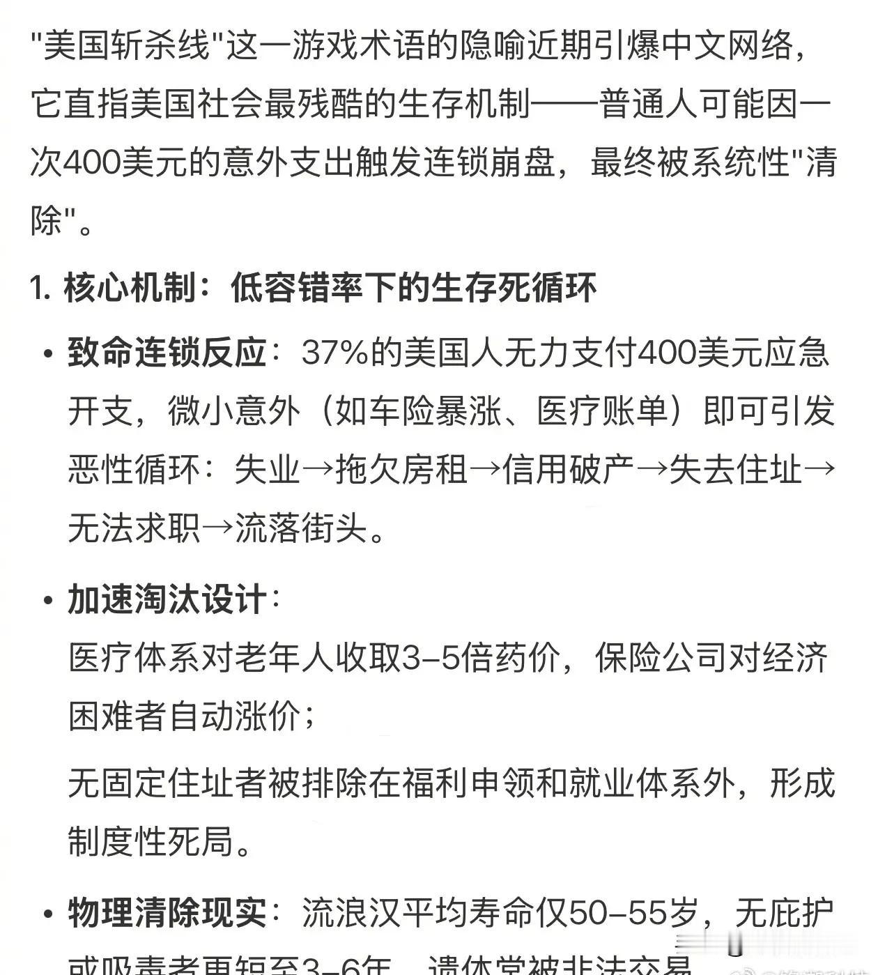 斩杀线的恐怖在于时时刻刻套在脖子上,准备好随时蹬掉你的垫脚石 斩杀线的绳索不是在遇到困难跌落的时候才开始勒紧的。 对美国人来说,斩杀线几乎不会放过0.1%之外的所有人。 美国中产及以下的脖子上时刻都套着一圈又一圈教育、医保、房贷、刚性消费、不透明账单、不合理法规和政策的绳索。 以保护资本的利益最大化的美国资本主义体系,房租是刚性的,车贷是刚性的,水电是刚性的,物业费是刚性的,……,所有资本的利益都是被刚性严格保护的。 资本至上,利润神圣,唯有吃饭,是可以压缩的。 美国斩杀线是体制的设计,实行的是真正的社会达尔文主义。 当你不能再为资本创造剩余价值的时候,你就是多余的! 绝对不能让短时间内聚集大量的失业人员,否则这些人极有可能会闹事,在中文词汇里就是革命。 所以要用食品、气候、药物、毒品等手段严格控制数量,这也是为什么失业人员大多数活不过3年。 有人出来说,这个系统保证了优胜劣汰!是不知道美国流落街头的有计算机博士、音乐家、篮球球星、演艺名星……。 美国流浪汉会弹钢琴 而是会弹钢琴的成了流浪汉。 那么违背事实,违反人性的话,可能轮到他和他的家人,才会理解。 有润人出来说,事实上没有这么严重。 其实,华人群体,被斩于马下的相对来说少些,是因为,本身很多人都是带资润去的,或者是依靠国内的退路。 但既便如此,不管早润晚润的,听说过什么华人世家大亨么!基本上阶层大多数都是往下跌落的。 在国内各种专家、教授、学者、讲师、高工、……,资本主义都教会他们无怨无悔的洗盘子。 对比美国的斩杀线,中国可能是地球上对底层人民最好的国家了! 中国党政投入巨大的人力财力物力搞脱贫攻坚,帮助贫困户脱贫。 防返贫监测系统,监测防止返贫! 大部分医院都主要由政府财政托底,还打破医疗和医药的市场垄断。各级医保局防止因病致贫。从医院大数据中把花费超过几万元以上的城乡居民的数据每月固定推送给各镇街,由各镇街根据这个名单下去核实评估人是否有返贫风险,然后给予救济。 中国人的贫困生存安全底线的保底,不单是农村乡下不可买卖宅基地,还有买完商品房后就不再每年征收房产税。 高等教育都是国家办的大学,高校办学所需的大部分资金都由国家出,个人求学只需出很低的学费。 你工作时公司会每月帮你交失业保险,这个是法律规定雇主必须交的,哪天你失业了,可以去社保部门办理失业登记,然后每个月可以在网上申请领失业金,但最多能领两年。没有工作,社区会搞培训,帮忙联系工作,还有低保兜底,……。 兼顾效率与公平,让每一个人不因一时困境失去生存权! 谁设计了美国的“斩杀线” 美国医疗系统的风险有多大 美“斩杀线”:从社会托底到个人兜底 聊聊农村养老金