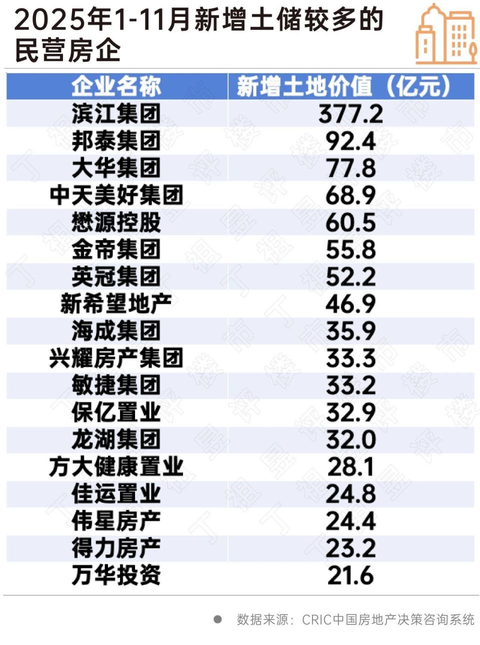 从近两年的新增土地来看,2025年1-11月新增土地价值较高的房企中出现了18家民营房企,是2024年全年的两倍,既有深耕当地持续拿地的企业如海成等,也有在核心城市“横空出世”拿下热点地块的企业,如北京懋源控股、上海佳运置业等。