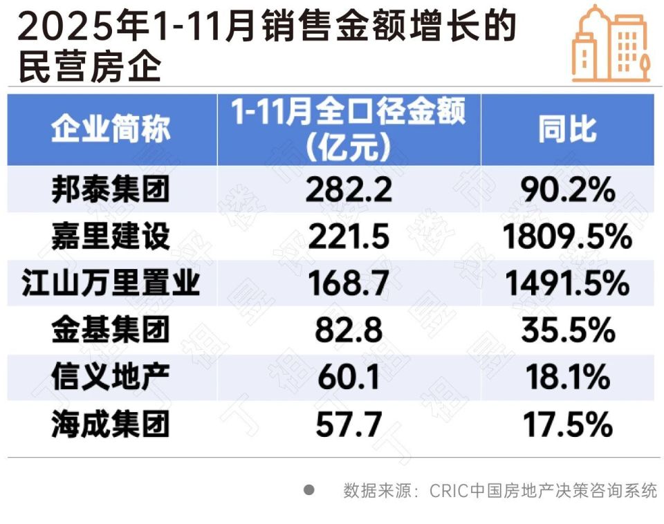 然而,从销售变化来看,2025年1-11月仍有6家民营房企销售金额同比逆势增长,其中嘉里建设、江山万里置业、邦泰集团增长超过50%。