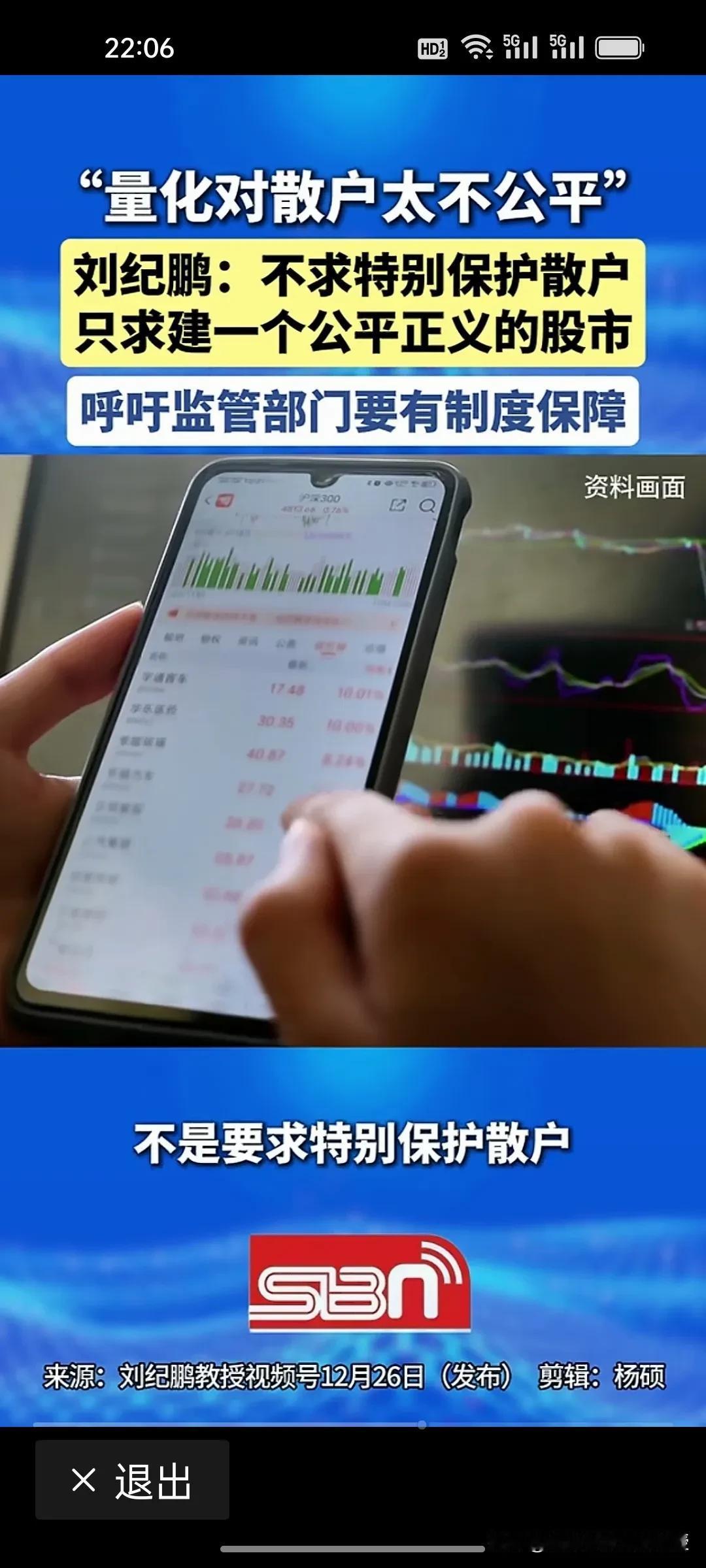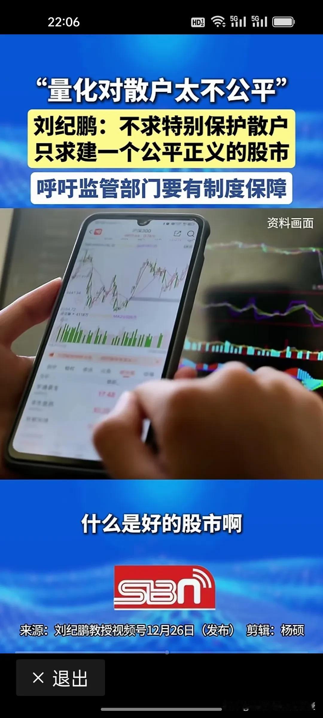 刚刚看到,刘纪鹏教授又喊话了!他直言,不求特别保护散户,只求建一个公平正义的股市,量化对散户太不公平,呼吁监管部门要有制度保障。这已经是刘教授第N次为散户关于量化发声。 今年量化机构的收益可以说是近几年最高的,宁波幻方量化排百亿私募第二,规模高达800亿,比去年多了200亿。今年大概帮客户赚了400亿,旗下产品最高收益高达52%,根据梁文锋的占股比例,他个人能分的收益大概在70-100亿之间。收益排行前十的百亿私募机构中有6家是量化机构,产品最高收益已经超过60%。 我认为监管部门应该重点抓三点:一是细化高频交易认定,差异化管控;二是严打虚假申报撤单等异常行为;三是压实机构及券商监管责任。公平交易才是资本市场行稳致远的根基。