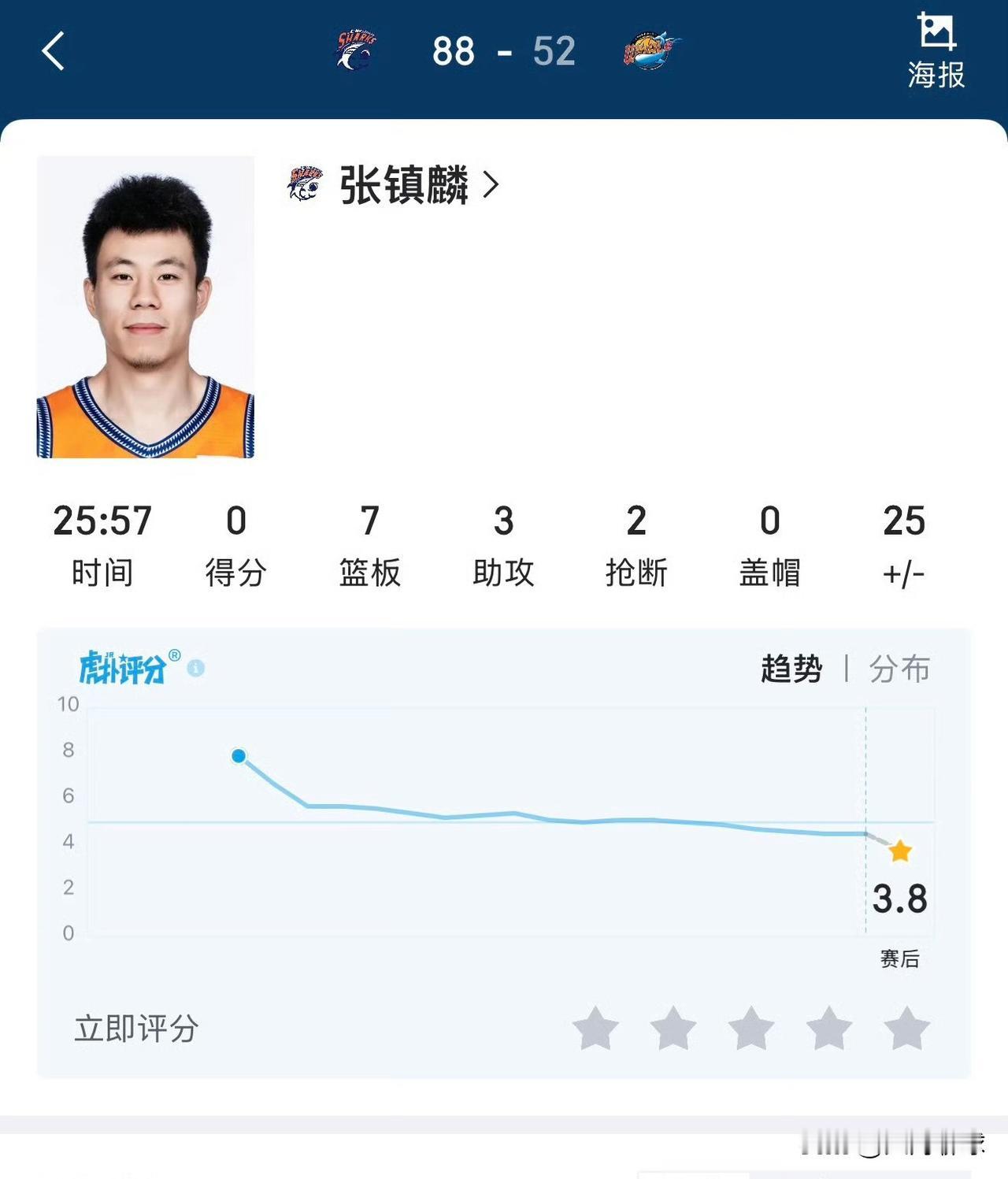 张镇麟本场竟挂0分!今晚上海久事 88-52 大比分拿下四川丰谷酒业 ,上海久事古德温依然高效拿下20分5篮板6助攻2抢断,但意外的是国手张镇麟本场竟然挂0,四川丰谷酒业新外援加克迎来首秀,上场18分钟,5投2中仅拿6分8篮板,张高铭拿下11分,杜智博8分!四川苦吞7连败