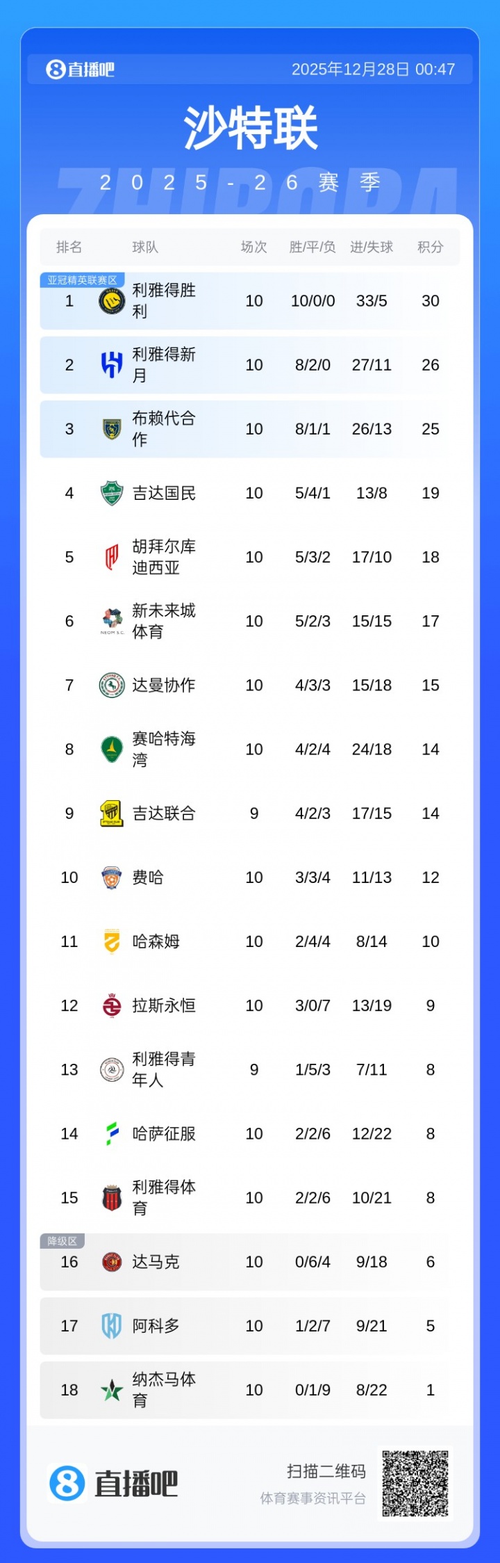 10轮轰33球!沙特联积分榜:利雅得胜利开季联赛10战全胜 4分领跑