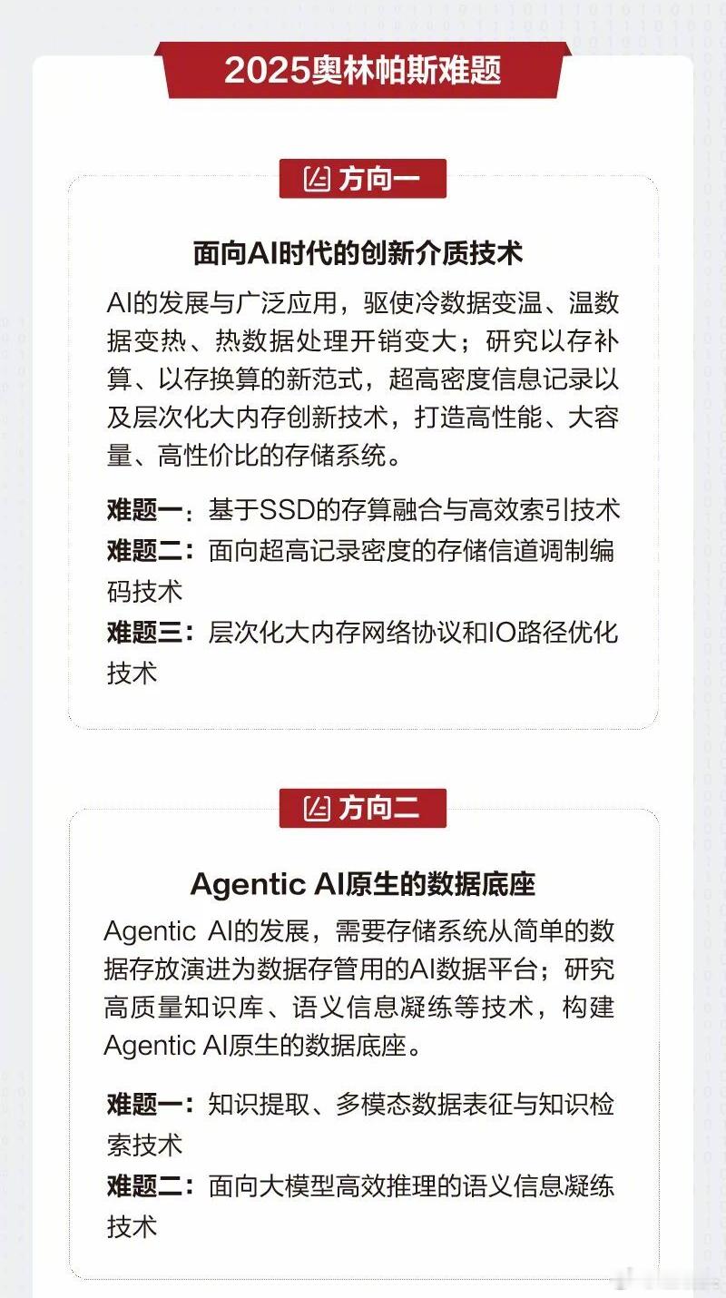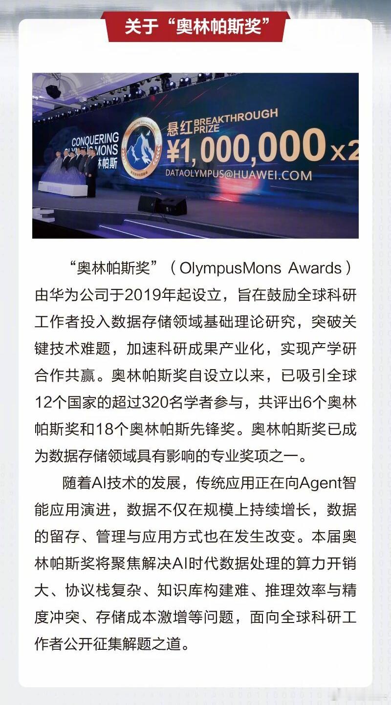 华为第六届奥林帕斯奖正式启动全球征集,奖金池总奖金300万元,设置2个奥林帕斯奖,奖金各100万元;5个奥林帕斯先锋奖,奖金各20万元。聚焦解决AI时代数据处理的算力开销大、推理效率与精度冲突、存储成本激增等问题。